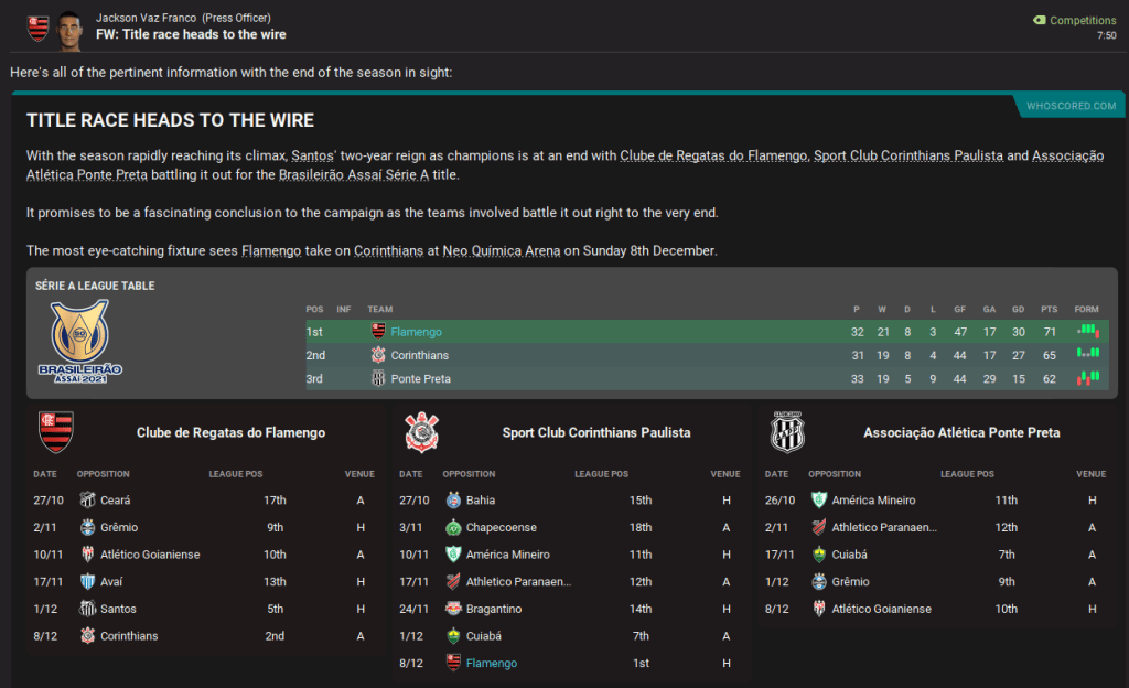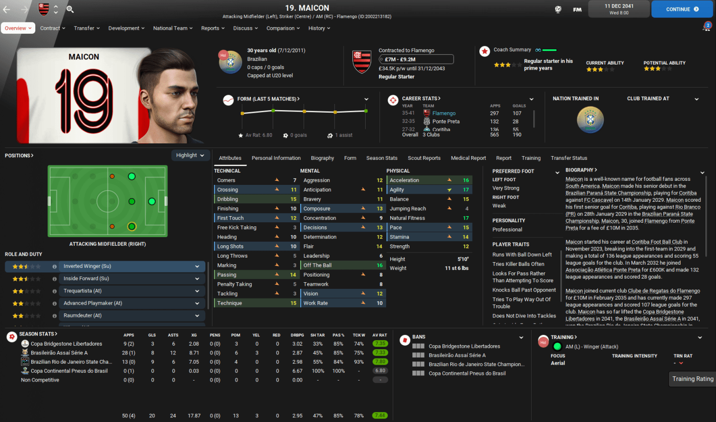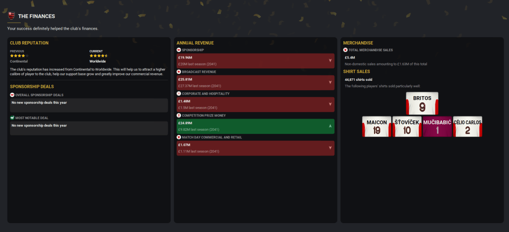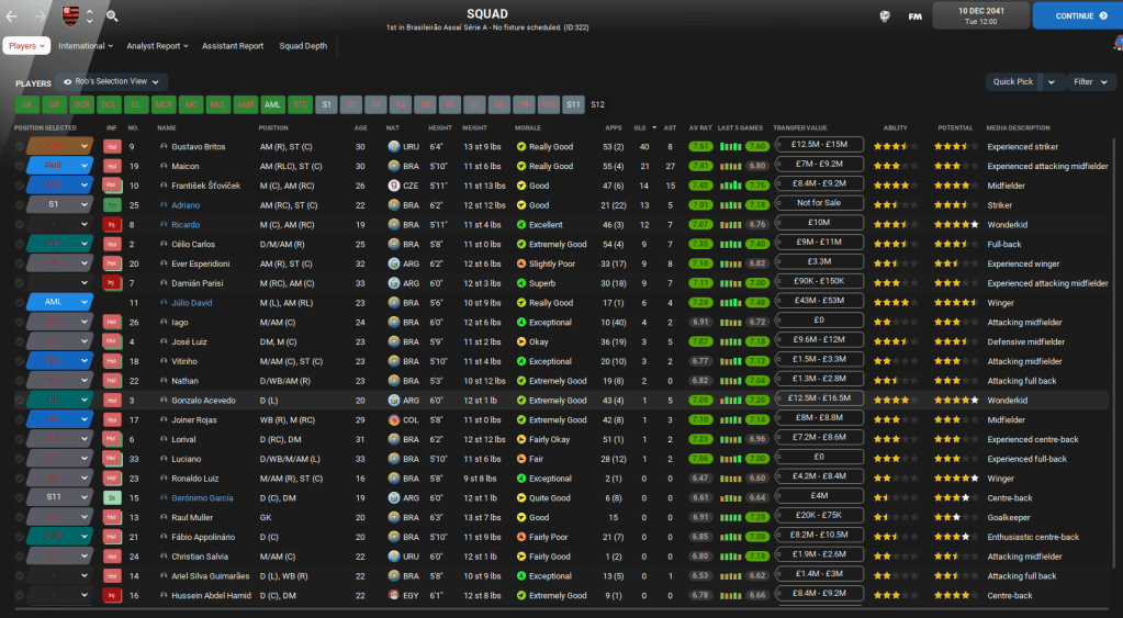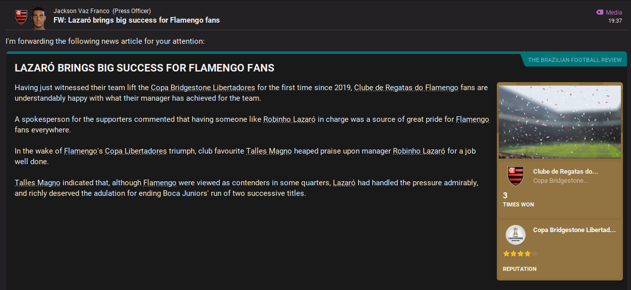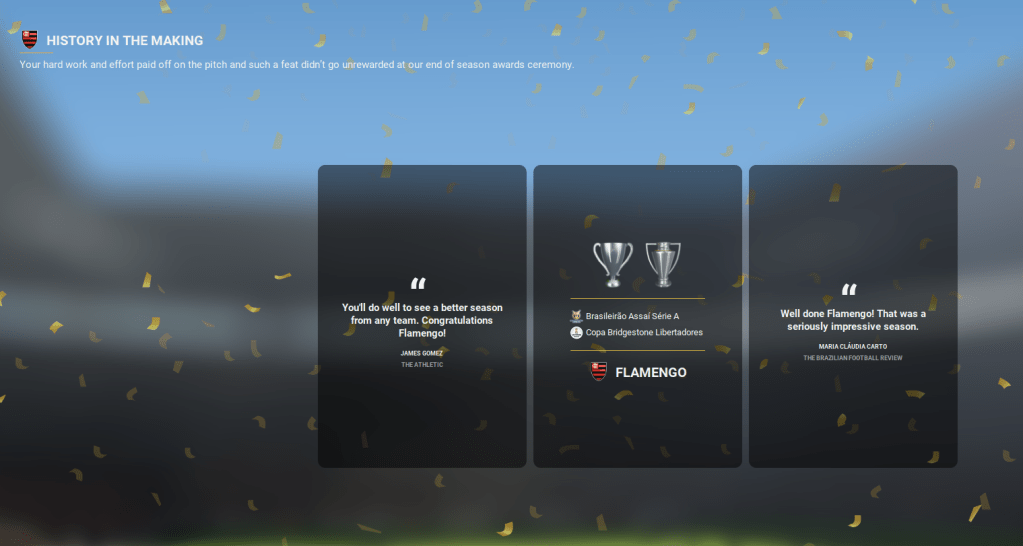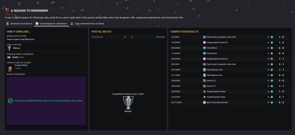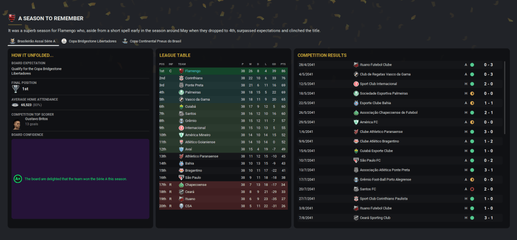 This was probably the finest season of Robinho Lazaró’s 20-year Football Manager career. Not only did he win Série A for the second time he also won the biggest domestic prize available in South America by leading Flamengo to the Copa Libertadores. Add to that the Rio State Championship and becoming world club champion!