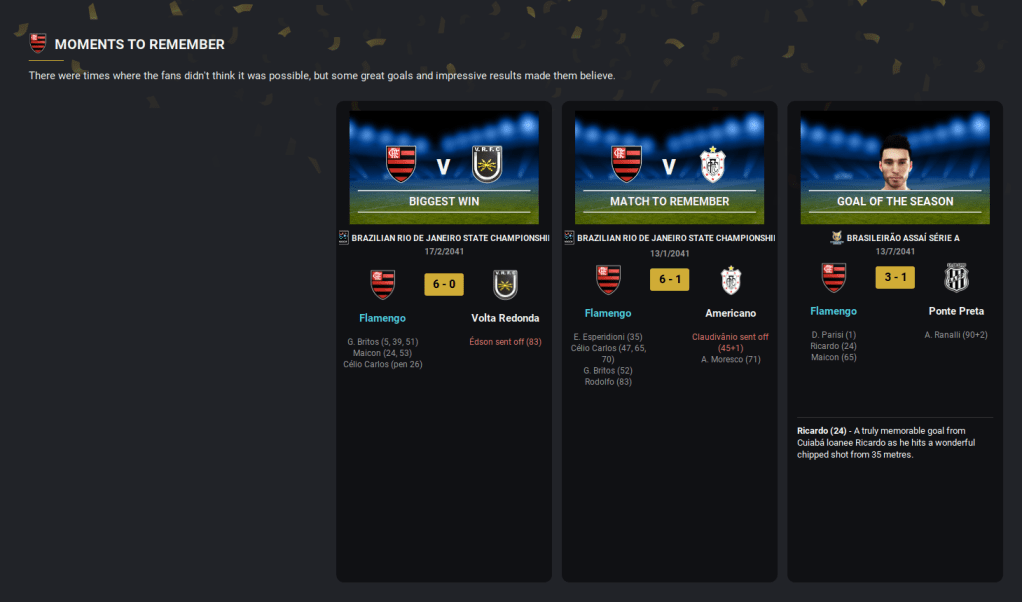 The players of Flamengo were welcomed back to Rio de Janeiro as national heroes on 9 July 2041. Thousands of locals took to the streets to celebrate the club becoming World Champions for the first time after winning the Club World Cup 2041.