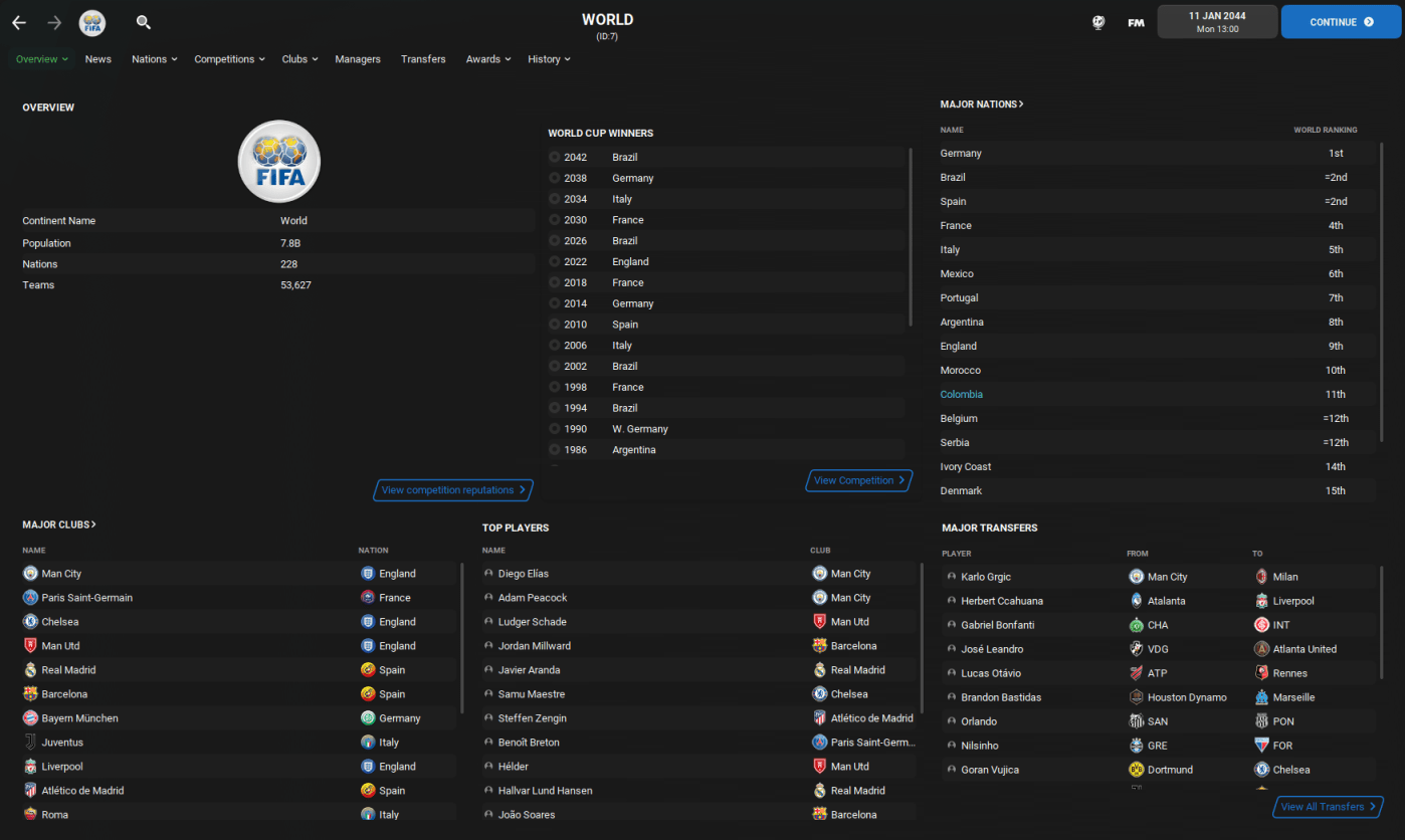 Brazil: There was a surprise winner in 2043 as Atletico Goianiense claimed their first-ever Série A title. Santos won three of the four previous titles and have three further titles during this save. Corinthians have been the dominant side in Brazil with seven titles, but none since 2038, and Flamengo have five.