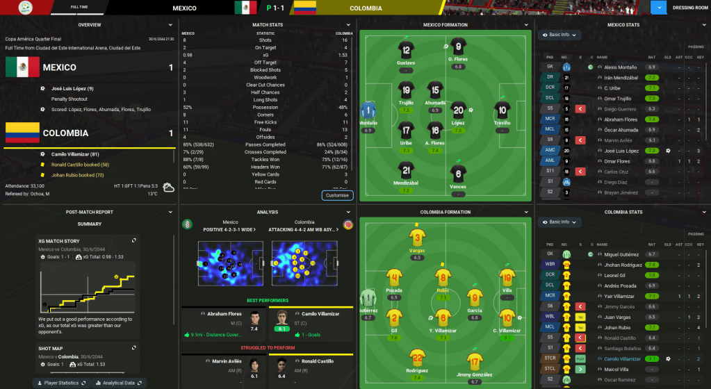 The quarter-final saw Colombia take on México, who finished second in Group B. The Mexicans obviously scored their first shot, because it would be unfair if they didn’t. And Colombia absolutely dominated the game but, as usual, didn’t make their chances count. That was until they finally scored through C Villamizar after 81 minutes. And that took the game straight to penalties.