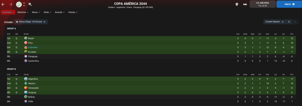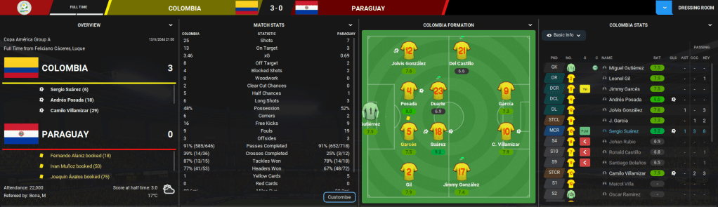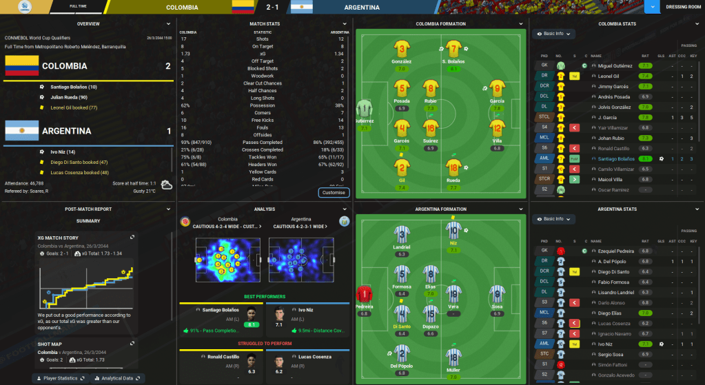 Lazaró’s first competitive game for Colombia came more than a year into his role, in October 2043. Their World Cup 2046 qualification campaign began by hammering Chile 4-1, led by a goal and two assists by Rubio, before an impressive 1-1 in Brazil that they were unlucky not to win. And the good start continued with a 2-0 win over Bolivia, a 2-1 win in Ecuador and a 1-0 win over Peru despite battering them. Lazaró had transitioned to a 4-2-4 formation, which led to their best performance yet as they defeated Argentina 2-1 with goals from Bolanos and a late winner by substitute Rueda.