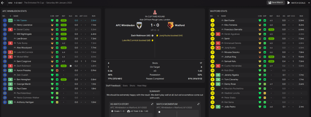 The reward was El FM Clasicó as we hosted Watford, against whom we randomly play an “FM Cup” friendly every pre-season, in round three. We saw off a Watford onslaught of 17 shots and went down the other end to nick a totally undeserved winner through homegrown striker Zach Robinson. We also committed 14 fouls to their 5 and gave away twice as many free-kicks. Now that’s what the Crazy Gang is all about!