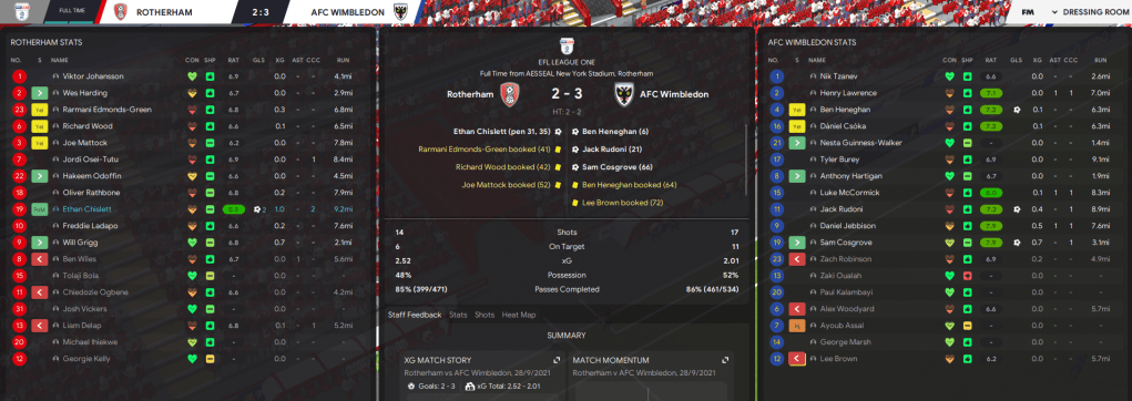 We recovered to beat Morecambe 3-0 before three successive draws ahead of a trip to high-flying Rotherham. We got off to a flyer as centre-back Ben Heneghan and Rudoni both scored from free-kicks. But our former player Chislett scored twice in four minutes to pull Rotherham level, including a ridiculous penalty decision. But, in true Crazy Gang style, we worked hard and got our reward as striker Sam Cosgrove came off the bench to get a deserved winner.