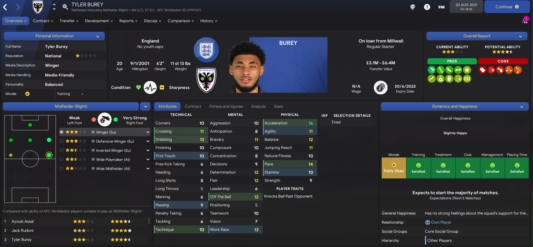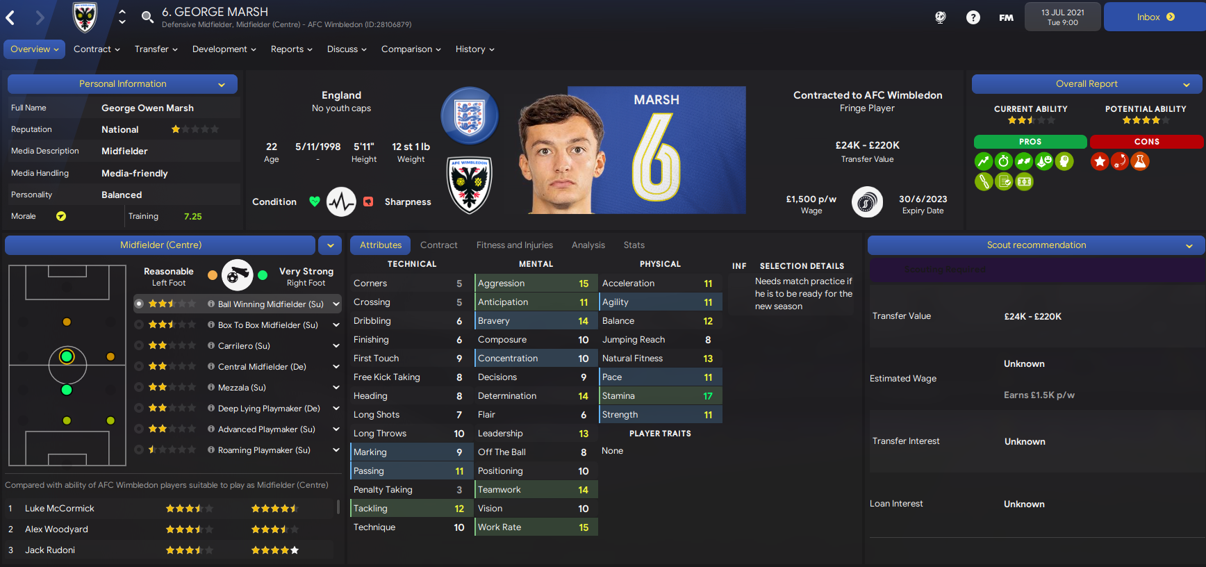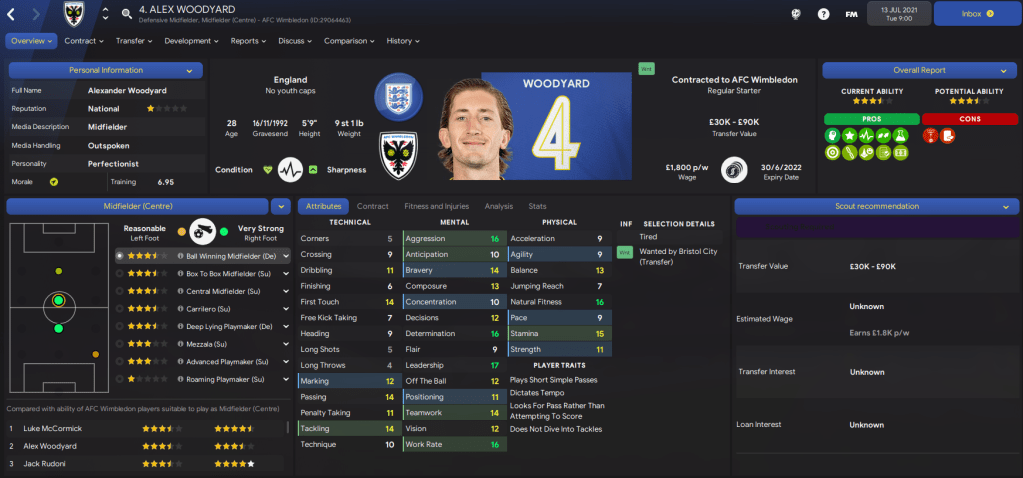 The key players to the Crazy Gang Class of 22 ethos may well be the new Vinnie Jones and Dennis Wise in the heart of the midfield. Alex Woodyard has 16 aggression, determination and work rate and 14 bravery and teamwork, and George Marsh has 14 and 15s in the five key areas. While centre-back Will Nightingale has 18 determination, 17 bravery and 16 work rate.