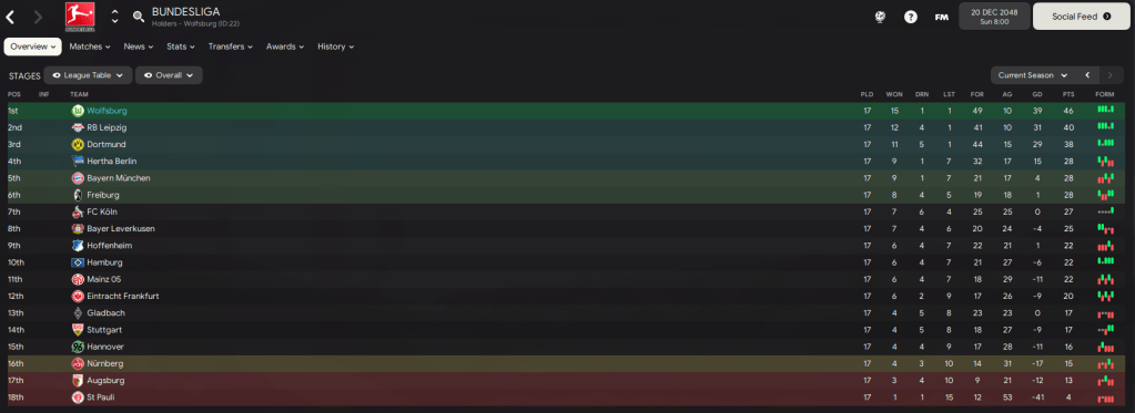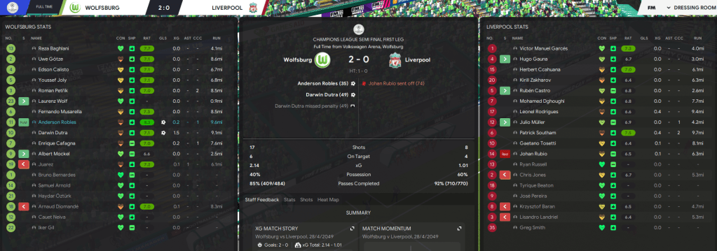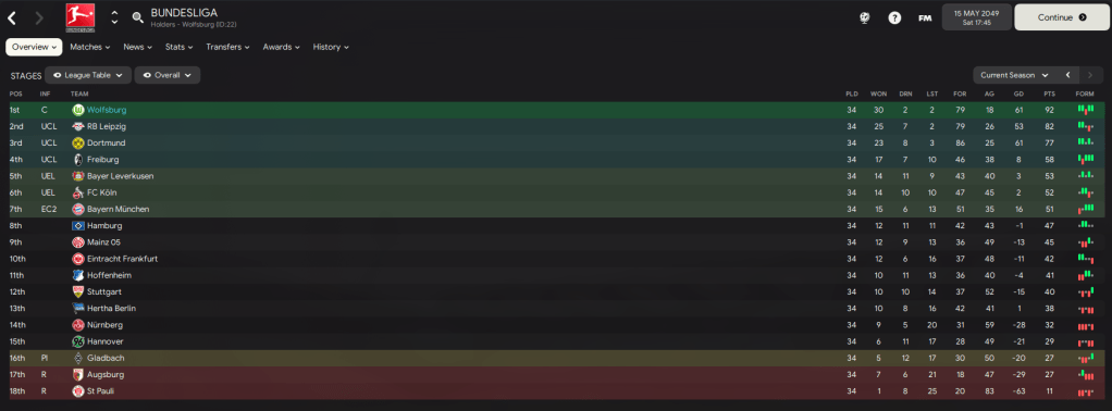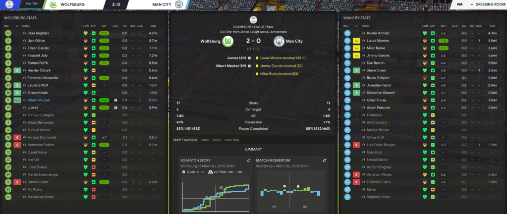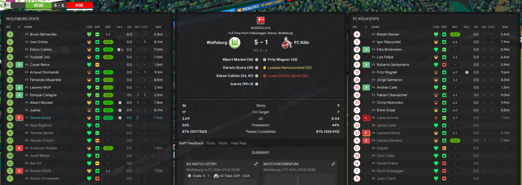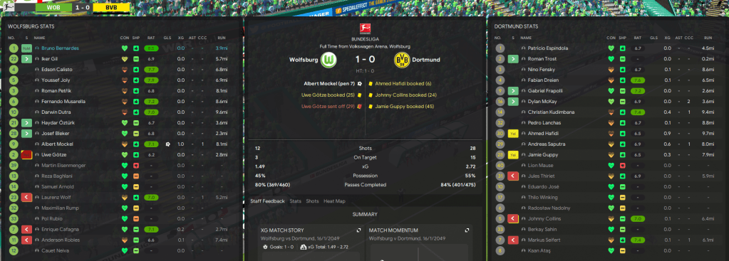 The last two German champions faced off as Wolfsburg entertained Hertha on the opening day of the 2048/49 campaign. But Wolfsburg proved themselves far the dominant force with 25 shots and 2.27 xG to five shots and 0.36 xG and won 3-1 with goals from Juarez, Mockel and Cafagna.