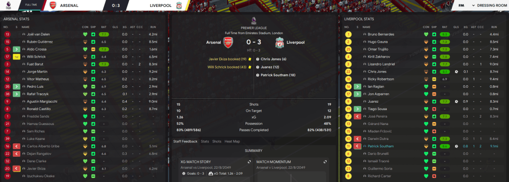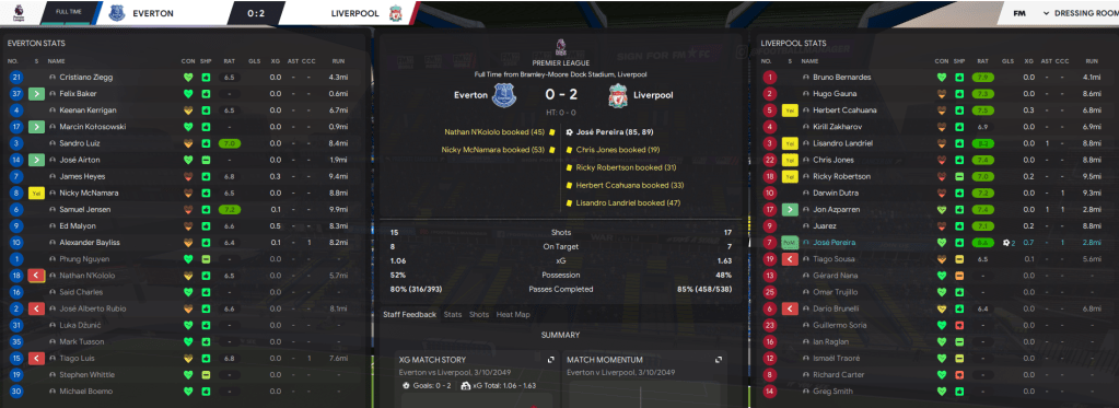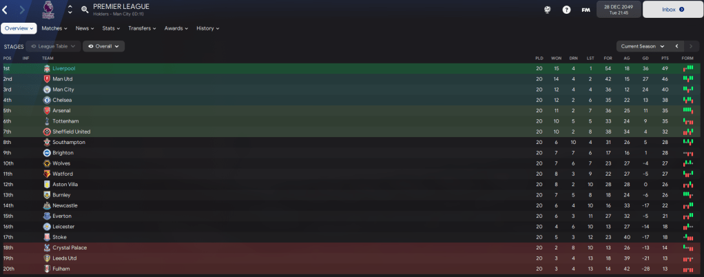 Liverpool have added four Premier League titles during the 28 year period of this save, taking them to a record 23. The most recent was the season before last in 2048. They’ve also won three Europa Leagues, five FA Cups and two Carabao Cups, but no Champions League in 30 years. In 2048/49, the reigning champions finished fifth behind Aston Villa, with Man City winning the title, which meant loads of players wanted out as they weren’t in the Champions League.