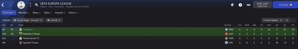 The Europa League served up an easy group with Ferencvaros, Austrian side Rheindorf Altach and Slovak side Spartak Trnava. And Liverpool unsurprisingly dominated, starting by beating Ferencvaros 3-0 away. Then rotated sides thrashed Rheindorf 4-1 at home and 3-0 away, Trnava 7-0 with seven different scorers at home then 5-1 away, and Ferencvaros 4-0.