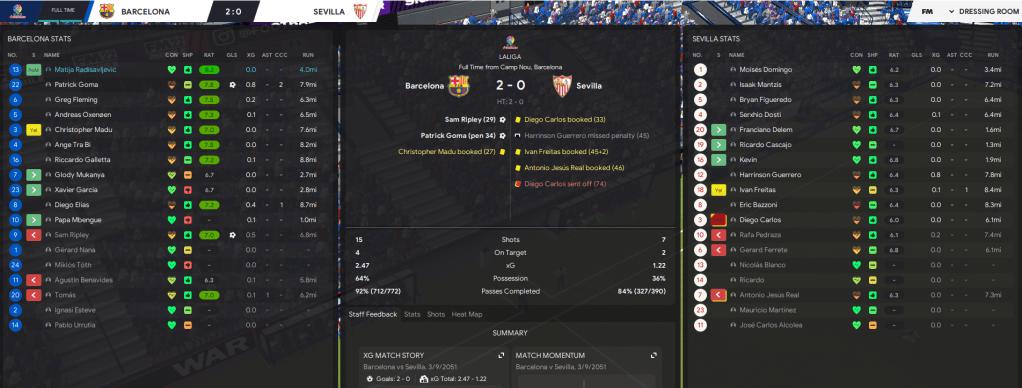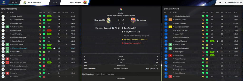 Lazaró’s first defeat as Barca boss came at Atlético, who nicked a 1-0 on 87 minutes. But a run of easier matches saw them breeze past Granada, Leganés, Getafe and Almeria, scoring 10 and conceding once. They were unlucky to draw 1-1 at Bilbao before more easy games flanked Lazaró’s first Catalan Derby at home to Espanyol. A quiet first half ended with the most un-Barcelona goal ever as Radisvljevic hoofed one over the top for Ripley to run through and tuck home. But winger Tomás offered a more typical Barca goal as he received the ball from Ripley and curled a beauty into the top corner for a 2-1 win.
