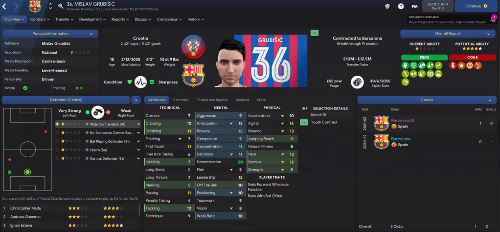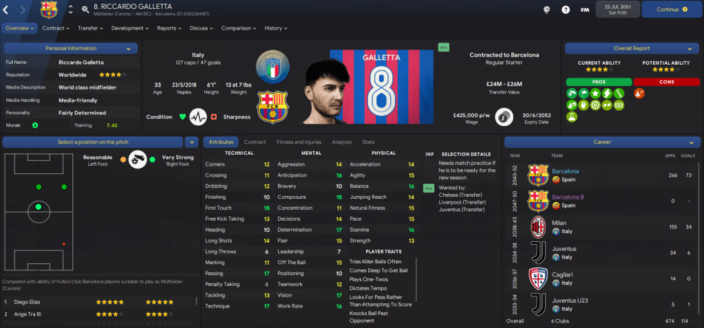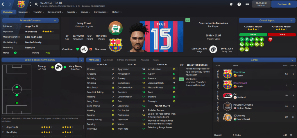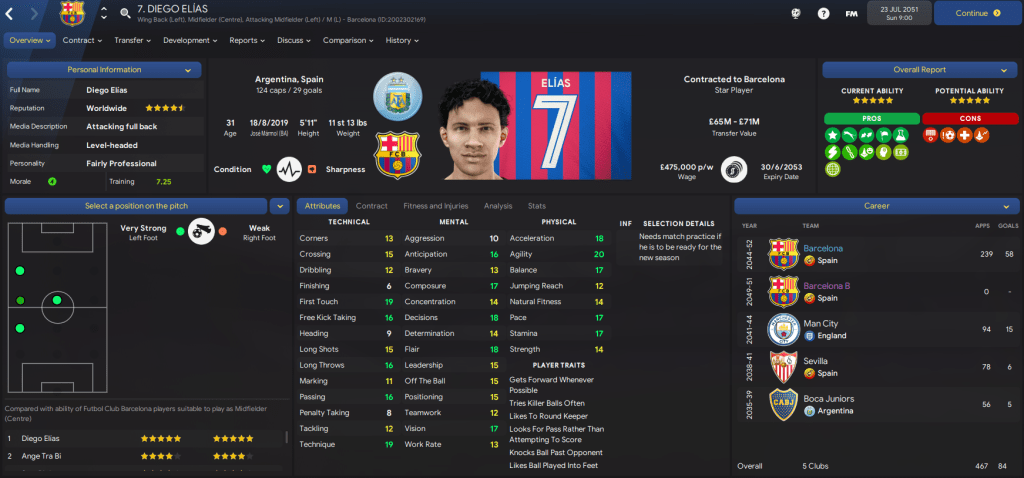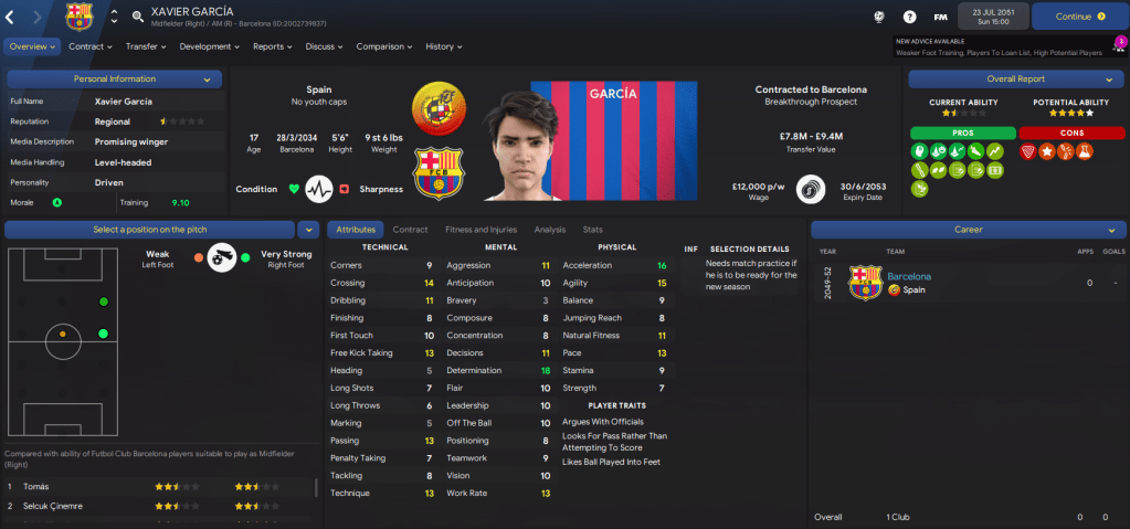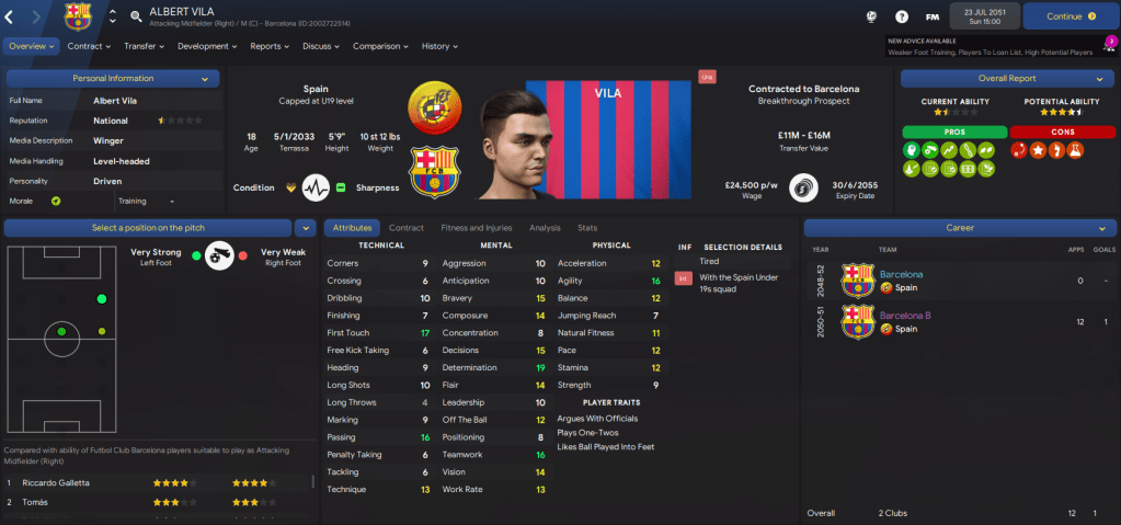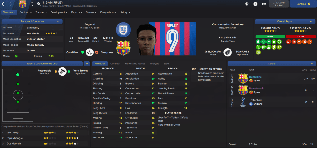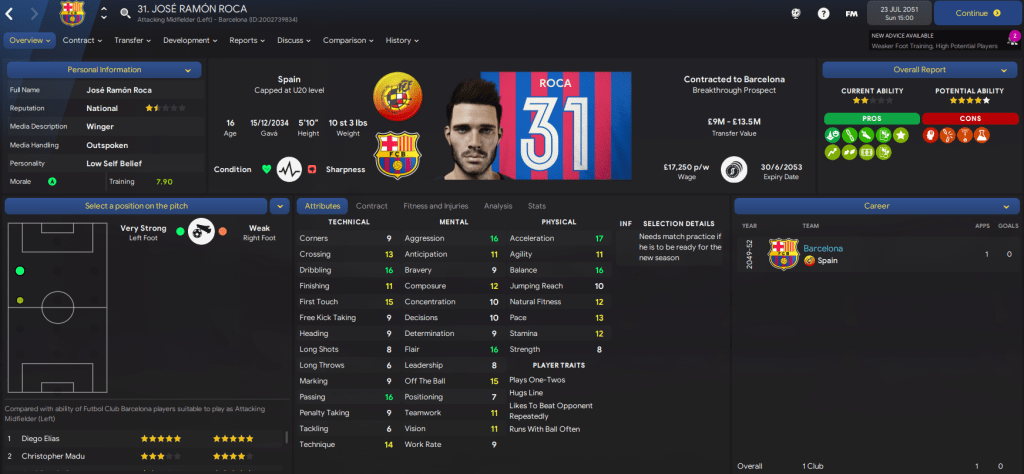 Remember how Barcelona are in massive debt at the start of FM22? Well, having turned on the Spanish leagues a few years ago, that situation hasn’t changed in 2051. Barcelona have a bank balance of minus £166.5 million and net debt of £155.5 million. And that presented a whole new type of challenge.