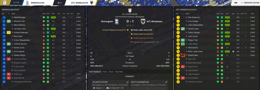 That poor start left us in 20th place with 9 points from 12 games, and 2 points clear of relegation. And that made a trip to 22nd place Birmingham massive. A terrible first half was quickly forgotten as Jones scored seven minutes after the break, only for Zidane Iqbal, who’s been awful this season, to get sent off. We then won a penalty that Urzi, who’s been nearly as bad, missed. So we went massively defensive and managed to hold on for a huge 1-0 win largely thanks to man of the match Sesay.