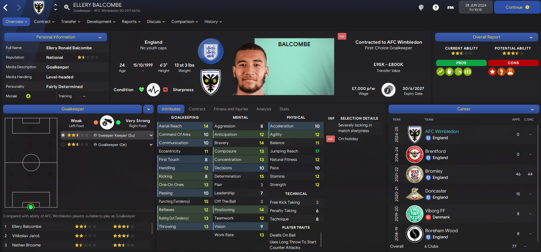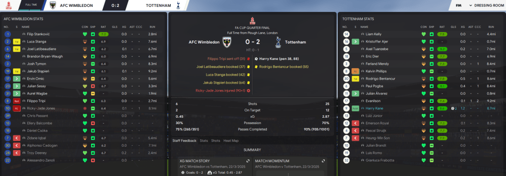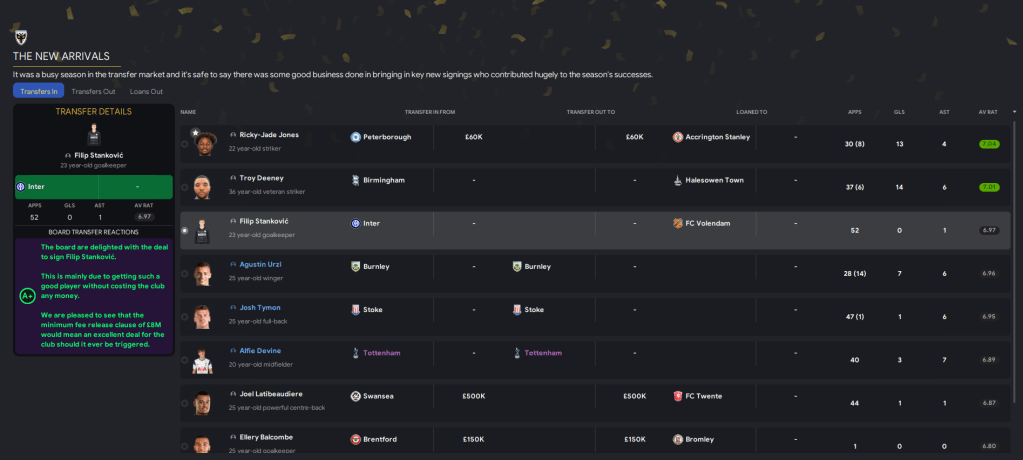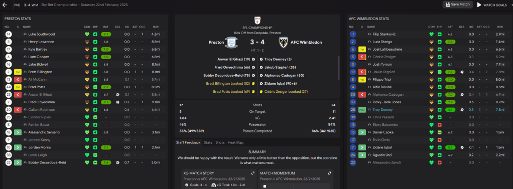 In our first game without him, we impressively came from two goals down to draw 2-2 with Bournemouth, who have 26 players who earn more than our highest-paid player! Then Stankovic made an impressive 14 saves to help us win the FM Battle at Watford. We also did well to beat Barnsley, who were up in 8th place, 2-1 in early February with Cadogan getting an assist on his debut. However, Donley suffered a broken ankle that ruled him out for the season.