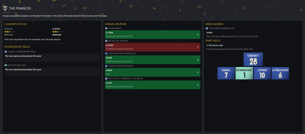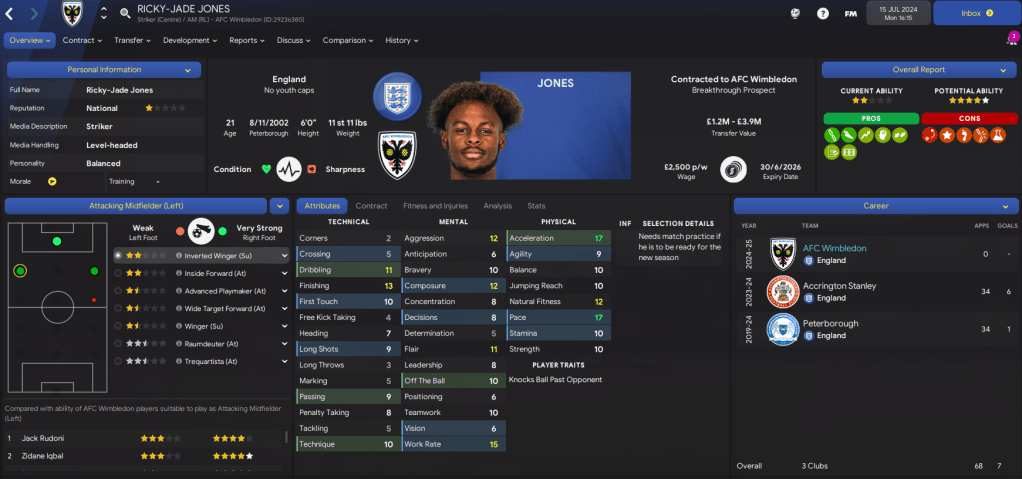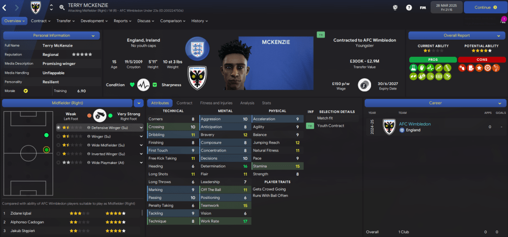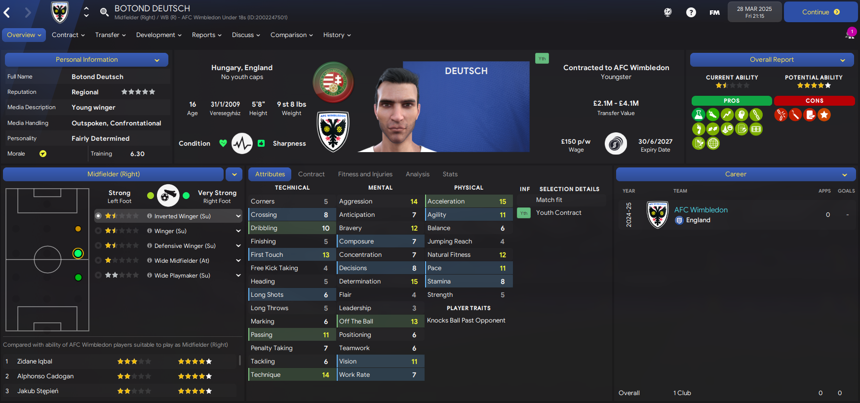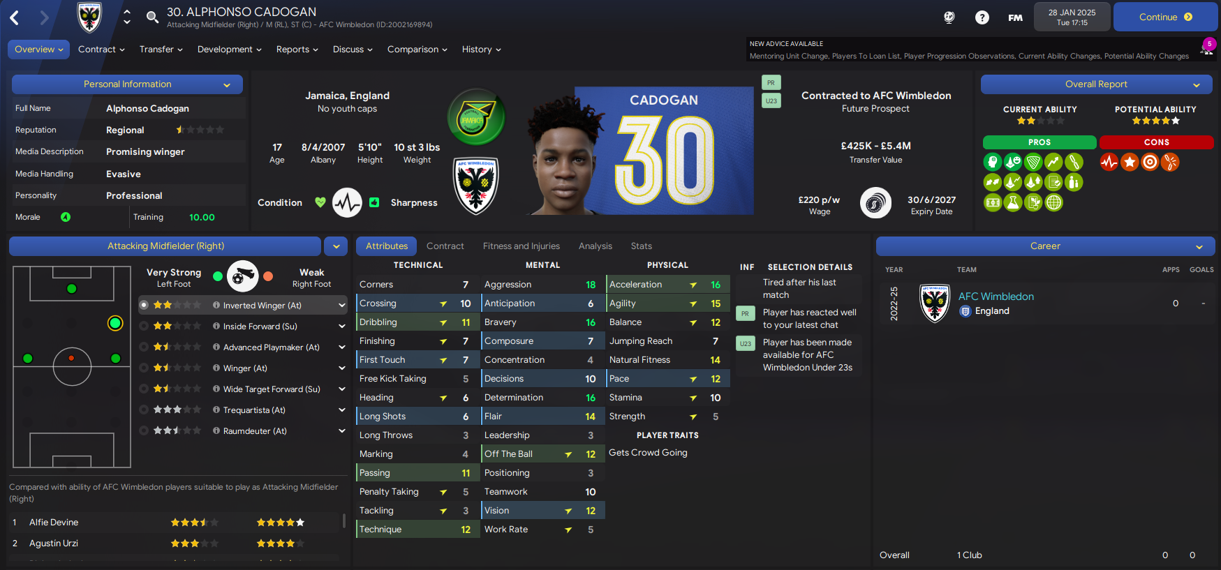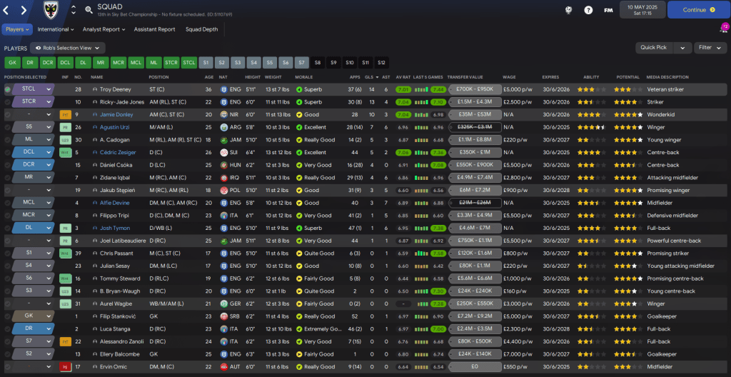2025 began with left-winger Rudoni, who hadn’t been particularly great this season, attracting a bid from West Brom. Considering he was out of contract in the summer and I wasn’t convinced about renewing it, I was happy for him to move for the right price and negotiated them up to £4.5m, which more than quadrupled the club-record sale of Luke McCormick to Stoke. We replaced him by signing 20-year-old Wolfsburg winger Aurel Wagbe for £45k and promoting youth product Alphonso Cadogan.