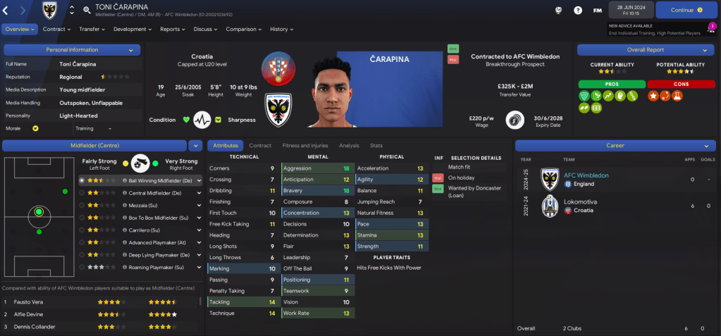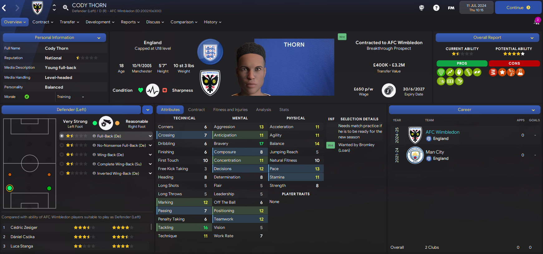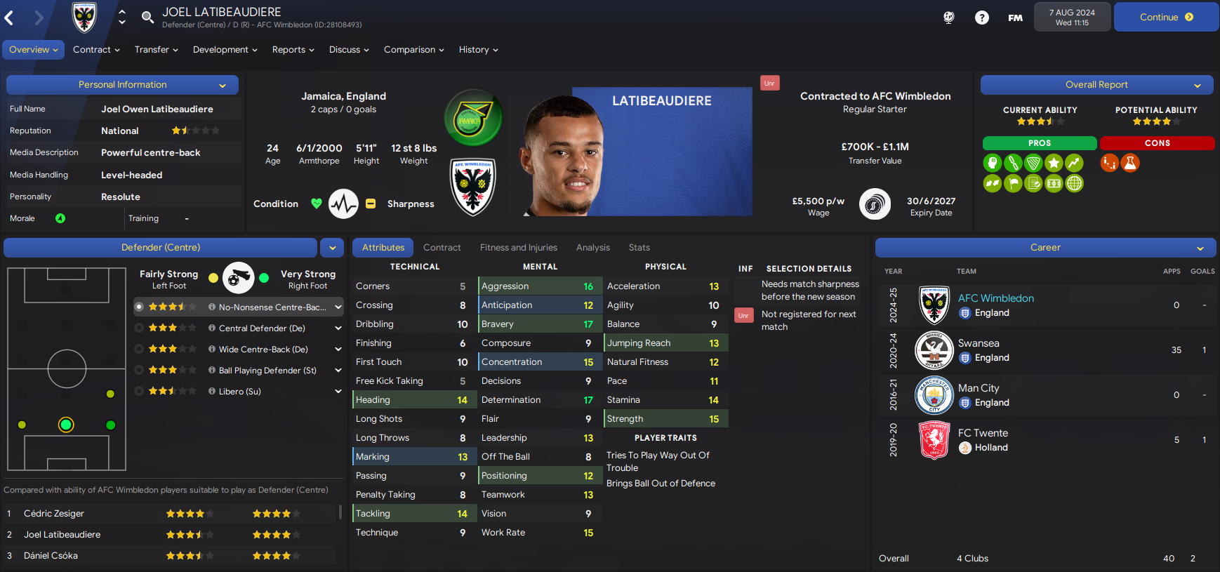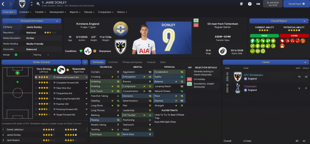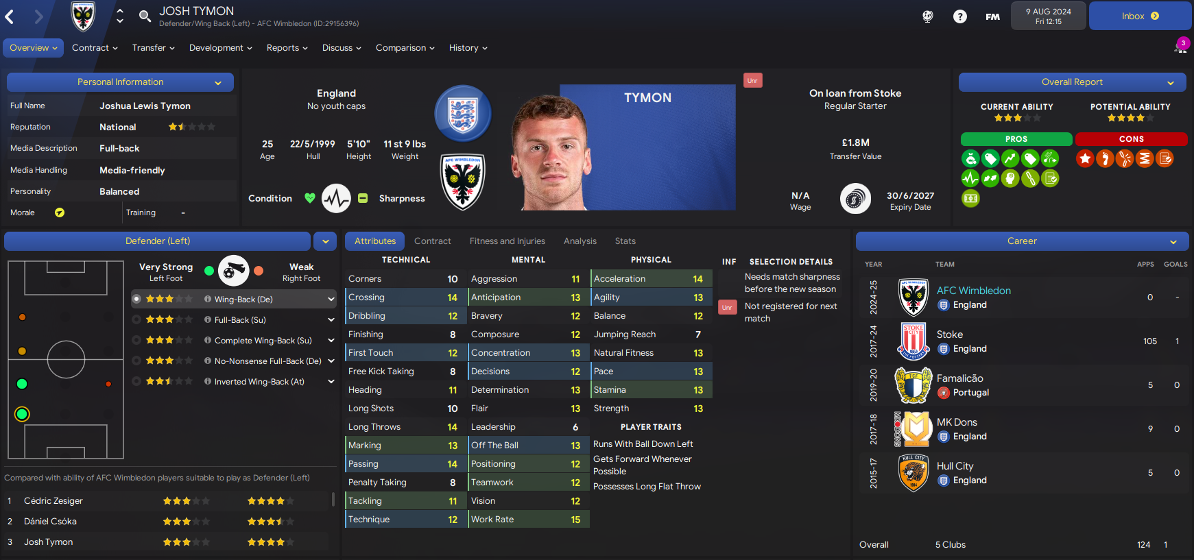 2025 began with left-winger Rudoni, who hadn’t been particularly great this season, attracting a bid from West Brom. Considering he was out of contract in the summer and I wasn’t convinced about renewing it, I was happy for him to move for the right price and negotiated them up to £4.5m, which more than quadrupled the club-record sale of Luke McCormick to Stoke. We replaced him by signing 20-year-old Wolfsburg winger Aurel Wagbe for £45k and promoting youth product Alphonso Cadogan.