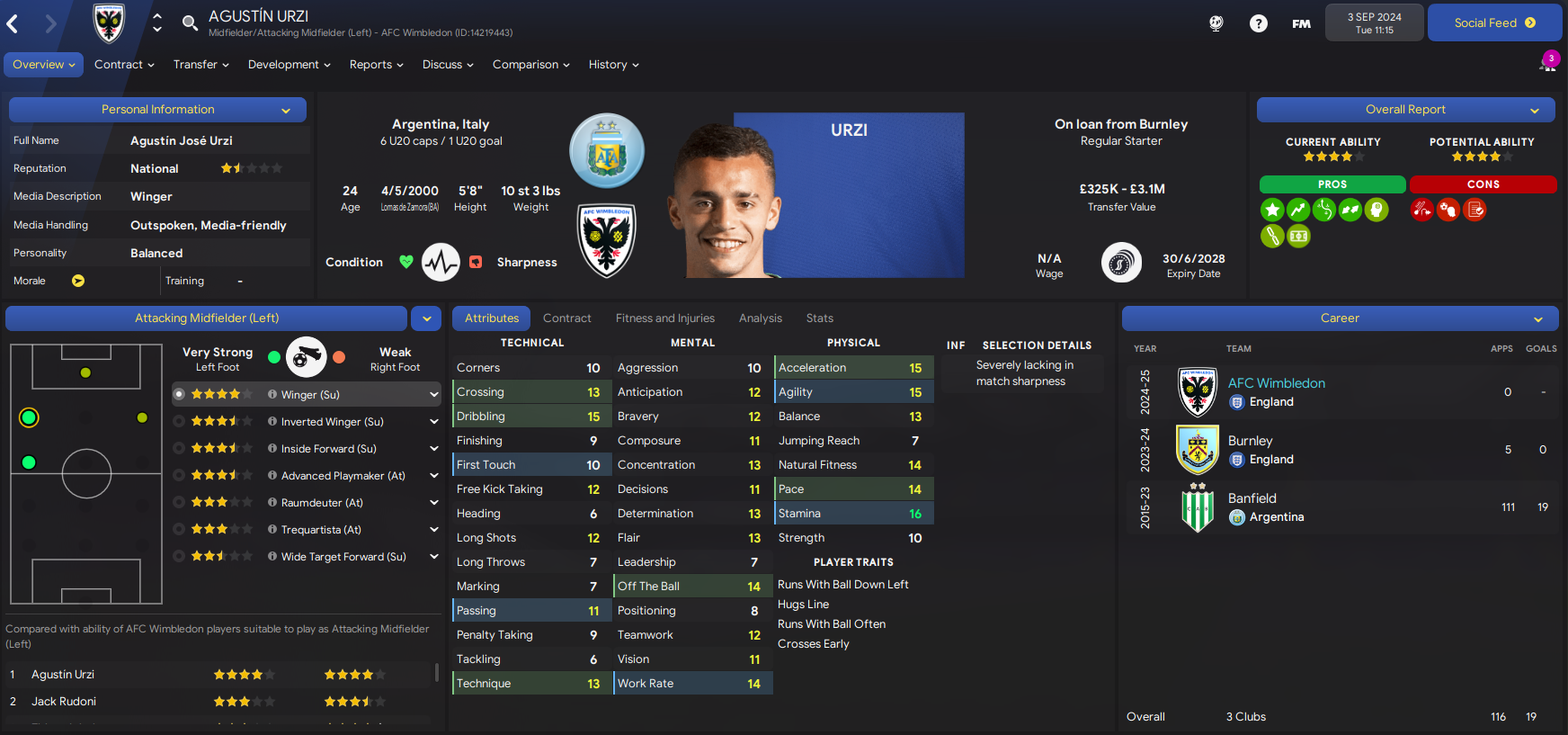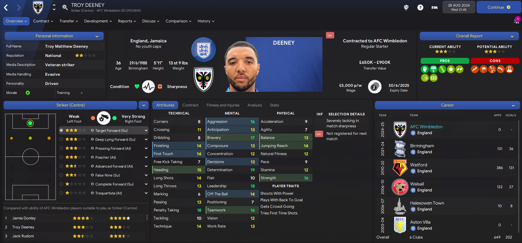 We couldn’t get Jebbison back on loan from Sheffield United, so instead took a bit of a gamble on Peterborough striker Ricky-Jade Jones for £60k. Star-wise he doesn’t look great yet, but that 17 pace and acceleration could prove very useful and he bagged 7 in 4 in pre-season! Then, at totally the other end of the scale, we took a punt on Troy Deeney, who’s now 36 but still has excellent mental attributes. He should also be a great influence in the dressing room, so I immediately made him club captain. We were also a little light at left-wing, so we loaned in Burnley’s Agustín Urzi on deadline day.