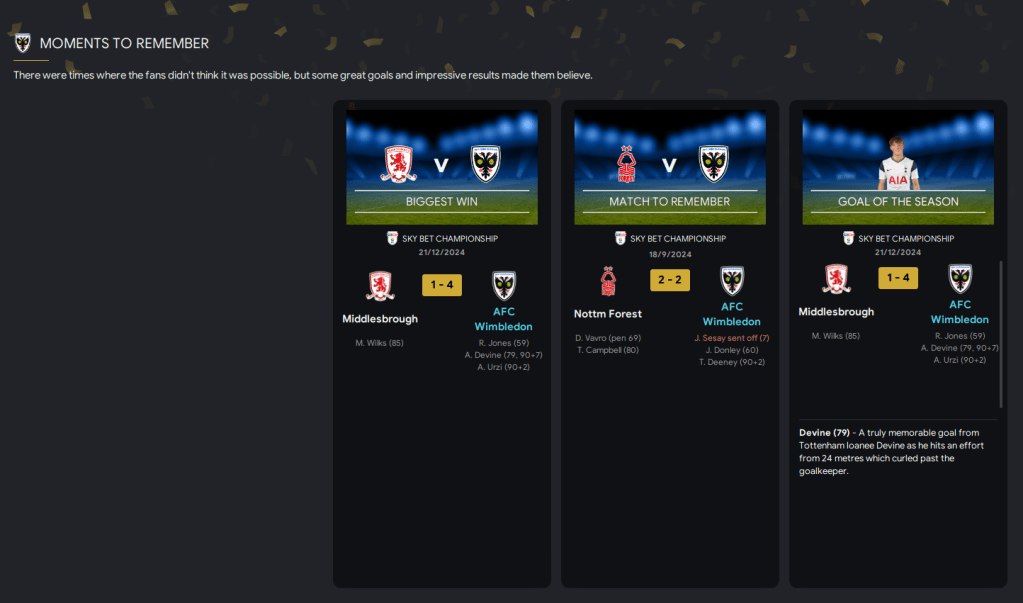 That helped us finish 1 position higher than last season in 13th. We gained 3 more points despite losing 3 more games! That means we;ve set Wimbledon’s highest-ever league finish for the fourth season in a row. We were also much better defensively, conceding 16 fewer goals, but also scored 16 fewer.