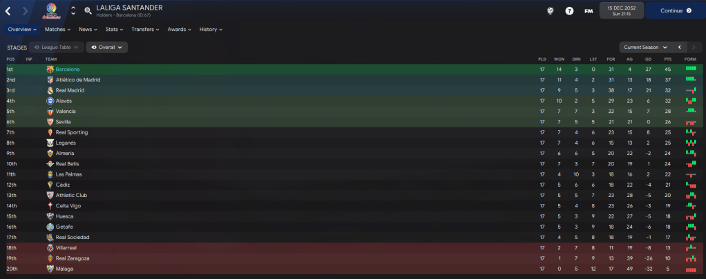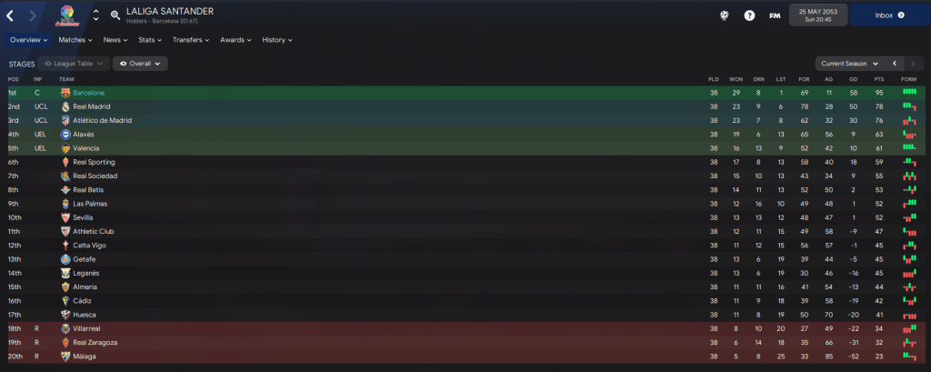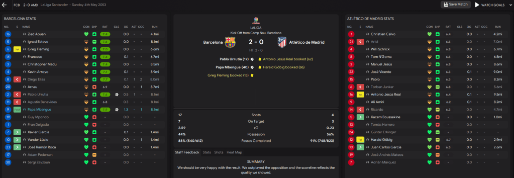 2053 began with a 1-0 extra-time Supercopa Final defeat to Real Madrid, which Lazaró wasn’t too bothered about as he had a mass of injuries. The league clean sheet streak ended in the first game of 2053 with a 2-1 win at home to Málaga but Aouani was back on the bike with a 0-0 at Alaves as Atlético beat Real 1-0.