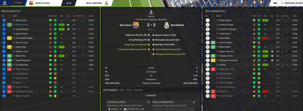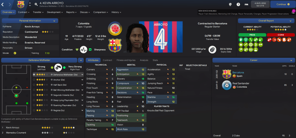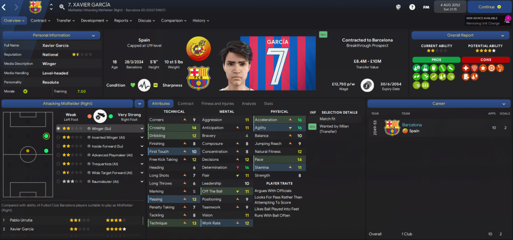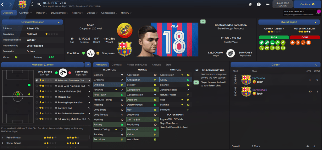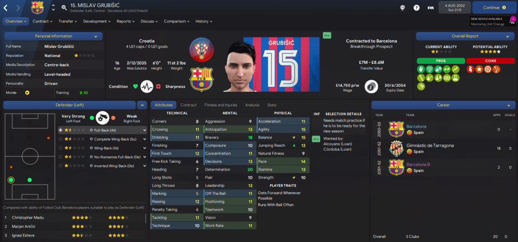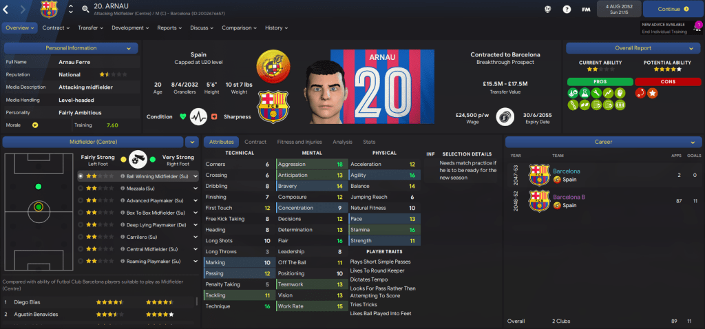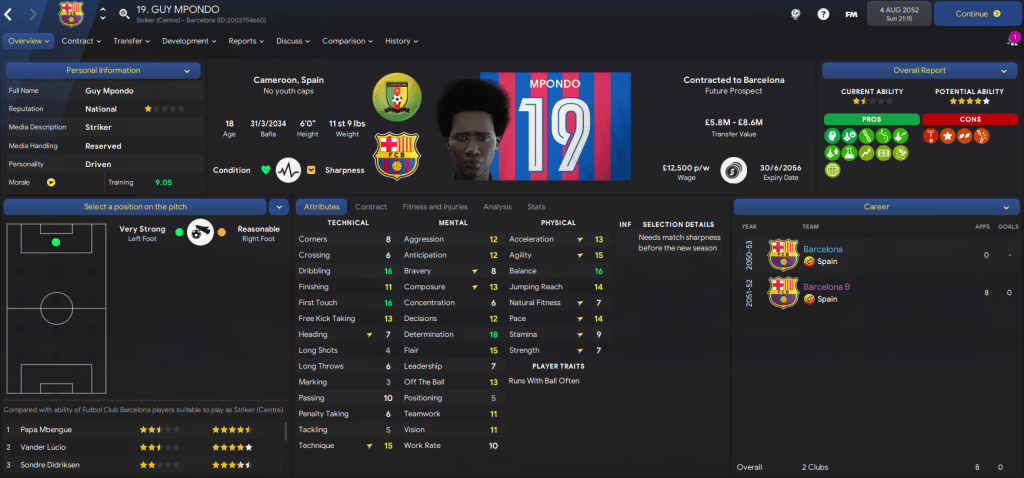 The biggest problem with managing Barca was financial, but not just the club’s finances. Every transfer target was overpriced and had outrageous wage demands. For example, a 3-star 22-year-old midfielder was earning £14,000 at Girona and the Barca scouts estimated his wage demand would be around £20,000. But as soon as he entered contract talks, he demanded £100,000 for no reason. A week later, he joined Bologna on £21,500-a-week. So that makes it almost impossible to buy even half-decent players. Also, LaLiga decided to reduce the number of non-EU players from three to two for 2053/54.