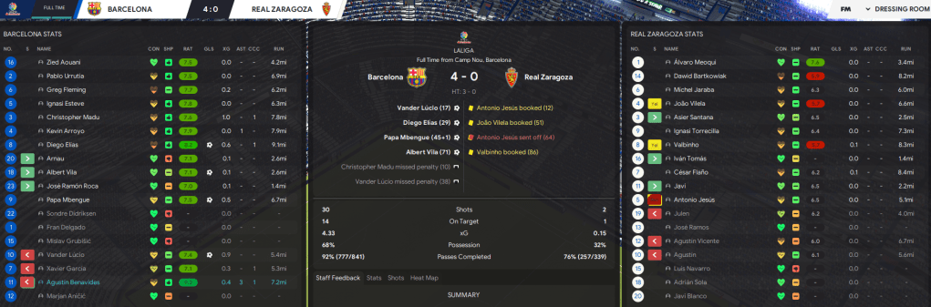 Lazaró’s second season began by welcoming newly-promoted Zarazoga to Camp Nou. They started on the front foot, winning and missing a penalty before Lúcio bagged a debut goal on 17 minutes. Elías doubled the lead and they missed another penalty before Mbengue headed home a third on the verge of half-time. Vila headed home his first senior goal after the break and they eased to a 4-0 win led by three Benavides assists.