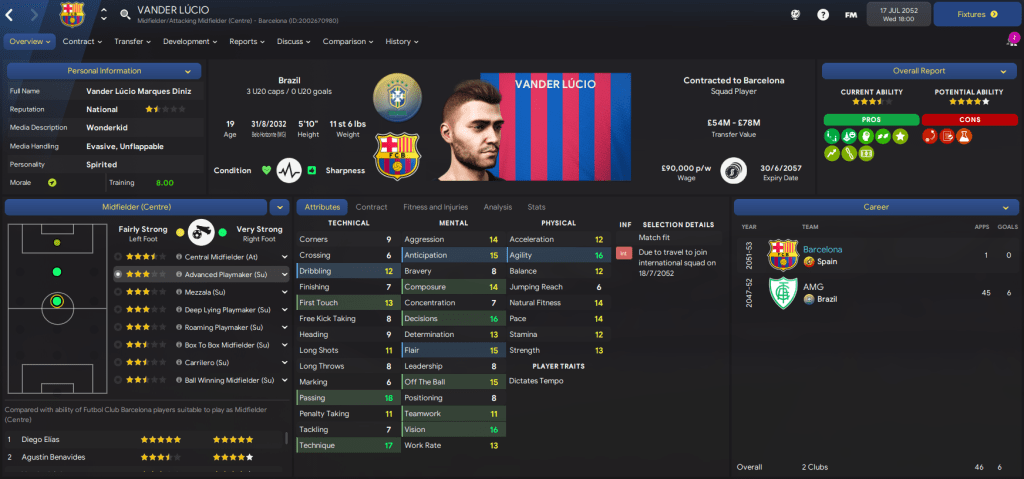 The next task was to sensibly reinvest some of that money in exciting young talent to get the Barca squad close to competitive. The first player through the door was exciting Brazilian midfielder Vander Lúcio, who came in for £13 million from América Mineiro. He was swiftly followed by a brilliant-looking goalkeeper in Belgian/Tunisian 18-year-old Zied Aouani, who cost £600,000 from Saudi side Al-Fateh.