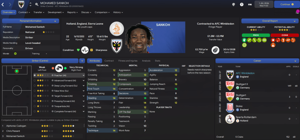 Our first transfer of the summer was striker Mohamed Sankoh, who arrived on a free from Stuttgart. He’s scored 68 in 149 for Stuttgart II yet not been given a chance with their first team. But I think he looks decent despite a lack of pace and work rate and as long as he never has to tackle anyone.