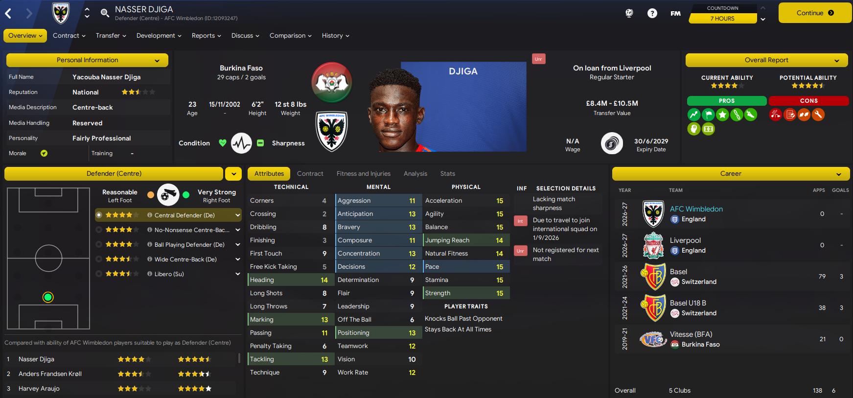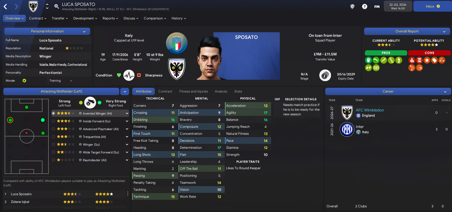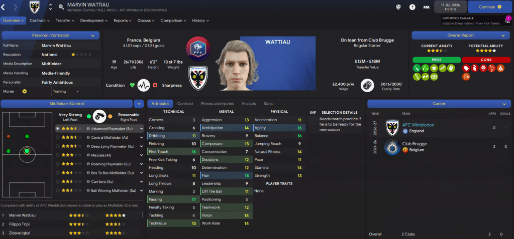 Loan deals have been crucial to our progression, but this year our approach was slightly different. Spurs refused to allow Donley to return and Sheff U wanted to keep our record goalscorer Jebbison, so we had to look elsewhere. We managed to loan in an exciting prospect I’d been tracking for a while in Club Brugge midfielder Marvin Wattiau. We also loaned in Fulham’s Harvey Araujo to fill Cresswell’s boots, exciting right-winger Luca Sposato from Inter, and left-winger Antonius Duncan from Spurs. On deadline day we replaced Latibeaudiere by loaning new Liverpool signing Nasser Djiga, then later added former England international Jack Butland as an experienced backup.