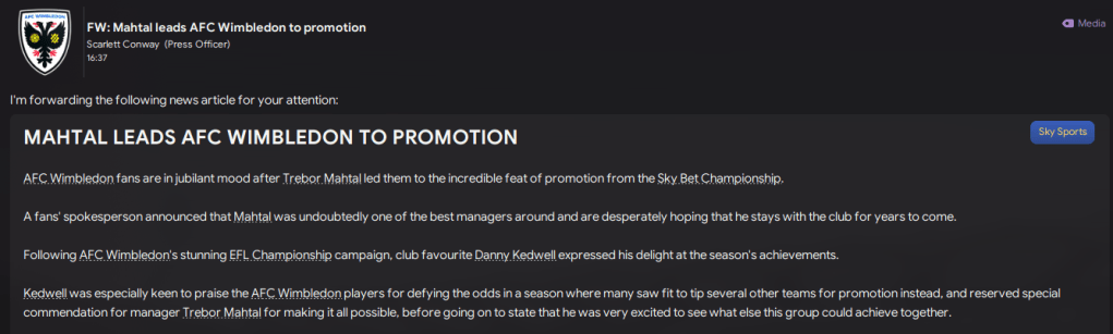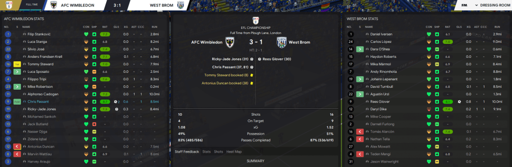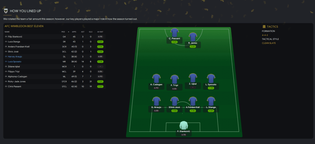 Jones was the top scorer with 29 in 43. I repeat. Ricky-Jade Jones was the top scorer in the Championship! He also had a league-high 10 player of the match awards and his average rating of 7.35 was only bettered by Ipswich’s Kerr Smith. Sposato’s 11 assists was only bettered by Bristol City’s Jay Dasilva. Tripi had the worst discipline in the league with 14 bookings and 2 red cards but Cadogan won the most tackles (131). I won Manager of the Year and Stankovic, Sposato and Jones were named in Players’ Team of the Year.
