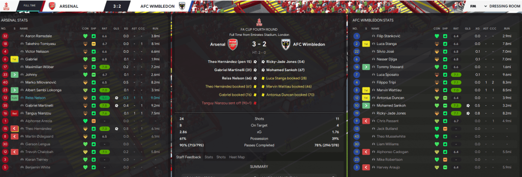 In the FA Cup, a 2-0 win at Luton resulted in… a trip to Arsenal in round 4, which again proved to be a cracker. Arsenal got another stupid penalty decision and doubled their lead through Martinelli after half an hour. But we improved after time as Jones chipped the keeper, Reiss Nelson restored the 2-goal lead only for Sankoh to go down the other end and score. Djiga then immediately crashed a header against the bar and we played so well after the break, but it wasn’t to be. And we fell to a narrow 3-2 loss, but I’m so proud of the boys! Plus we bagged £400k in gate receipts…