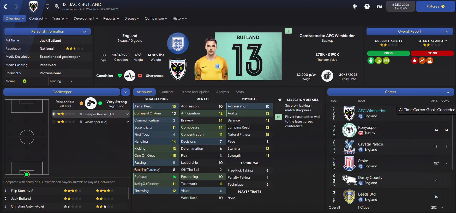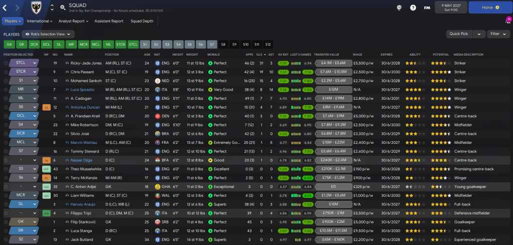 The squad is now really young with an average age of 20.6. Before Butland’s arrival, new captain Filippo Tripi was the oldest player aged 24 and 16 of the 22-man squad are 21 or under. We also don’t pay any players more than £5.5k-per-week and spend just £67k-a-week on wages. However, I think the squad is looking in strong shape with 12 players of up to 4.5-star potential and, for the first time, all our starting 11 are considered to be of Championship quality.