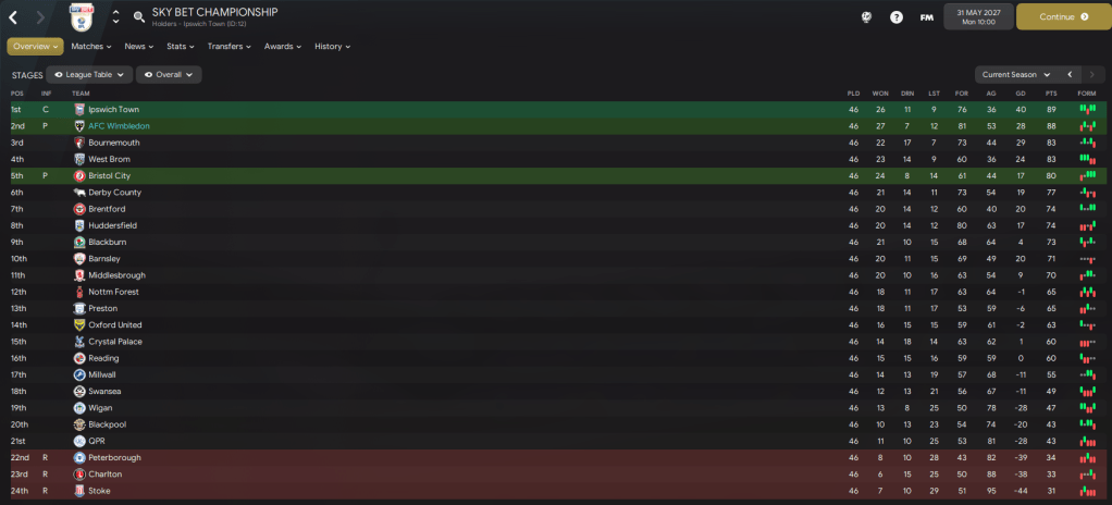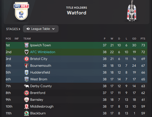 Unbelievably, with 8 games of the 2026/27 campaign remaining AFC Wimbledon, with by far the lowest wage spend in the Championship, were in contention to reach the Premier League. We trailed Ipswich, who had a game in hand, by 1 point and were 3 points clear of Bristol City. There were only 8 points between 1st and 6th and 7 points between 5th and 11th. And our run-in was fairly tricky.