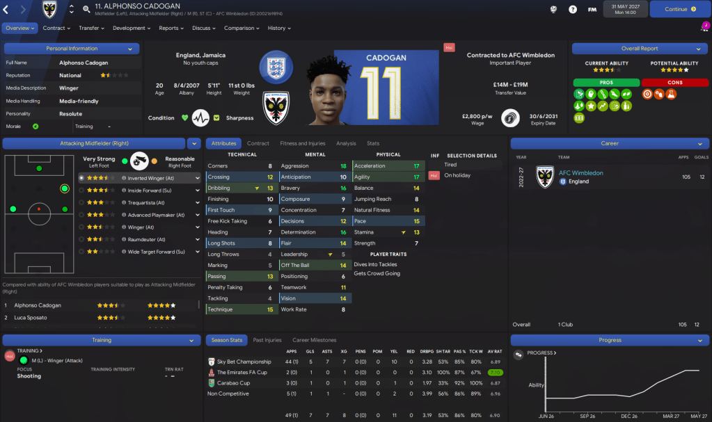 Alphonso Cadogan: The star man of these products is Jamaica-born winger Cadogan, who played 50 games last season and has 12 goals in 105 league appearances since coming through the academy in 2023. Importantly for the way we play, he has 18 aggression, 16 bravery and determination, 17 acceleration and 15 pace. And he recently signed a new contract through to 2029.