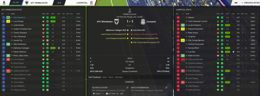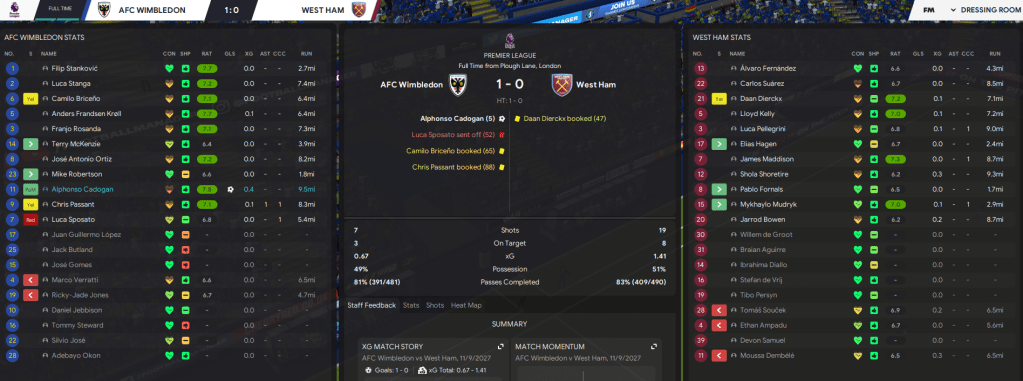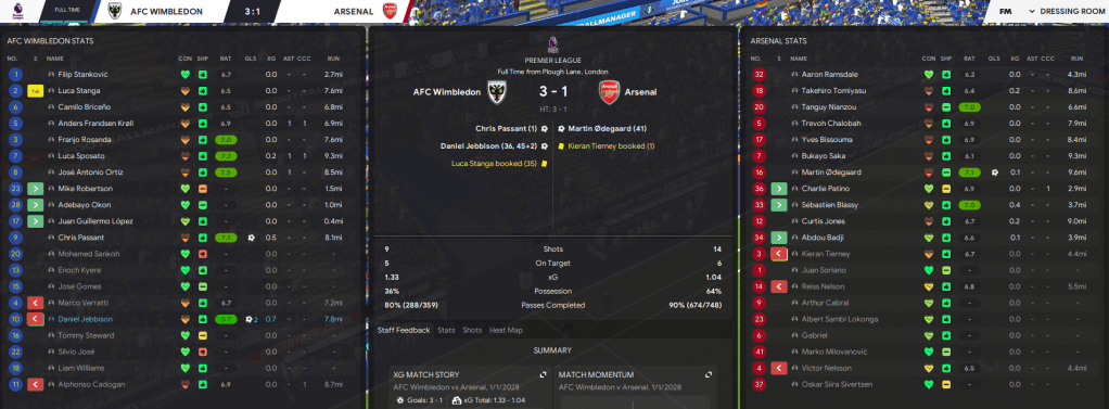 2028 got off to a flyer as Passant scored 40 seconds into our New Year’s Day clash with Arsenal. Jebbison doubled the lead then Odegaard got one back and I feared the worst. But a brilliant finish saw Jebbison double his tally just before the break and we held on for revenge and our first win over the “big six.”