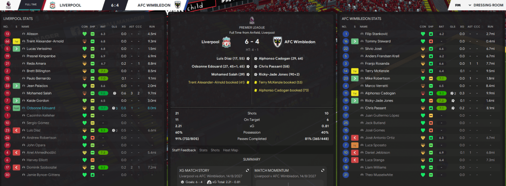 As a newly promoted side, Anfield probably isn’t the place you want to go on opening day. We started quite well, having a few shots before Liverpool scored their first effort on target then swiftly doubled their lead. But Alphonso Cadogan stepped up to score a stunner, collecting the ball on the right, dribbling through a few players and smashing it into the top corner! Liverpool battered us, eventually scoring 6, but we fought valiantly as fellow academy product Chris Passant and Ricky-Jade Jones also scored on their Premier League debuts and Cadogan bagged his second. It was a heavy beating, but I was really proud of most of the lads. And how many teams score 4 goals at Anfield?!