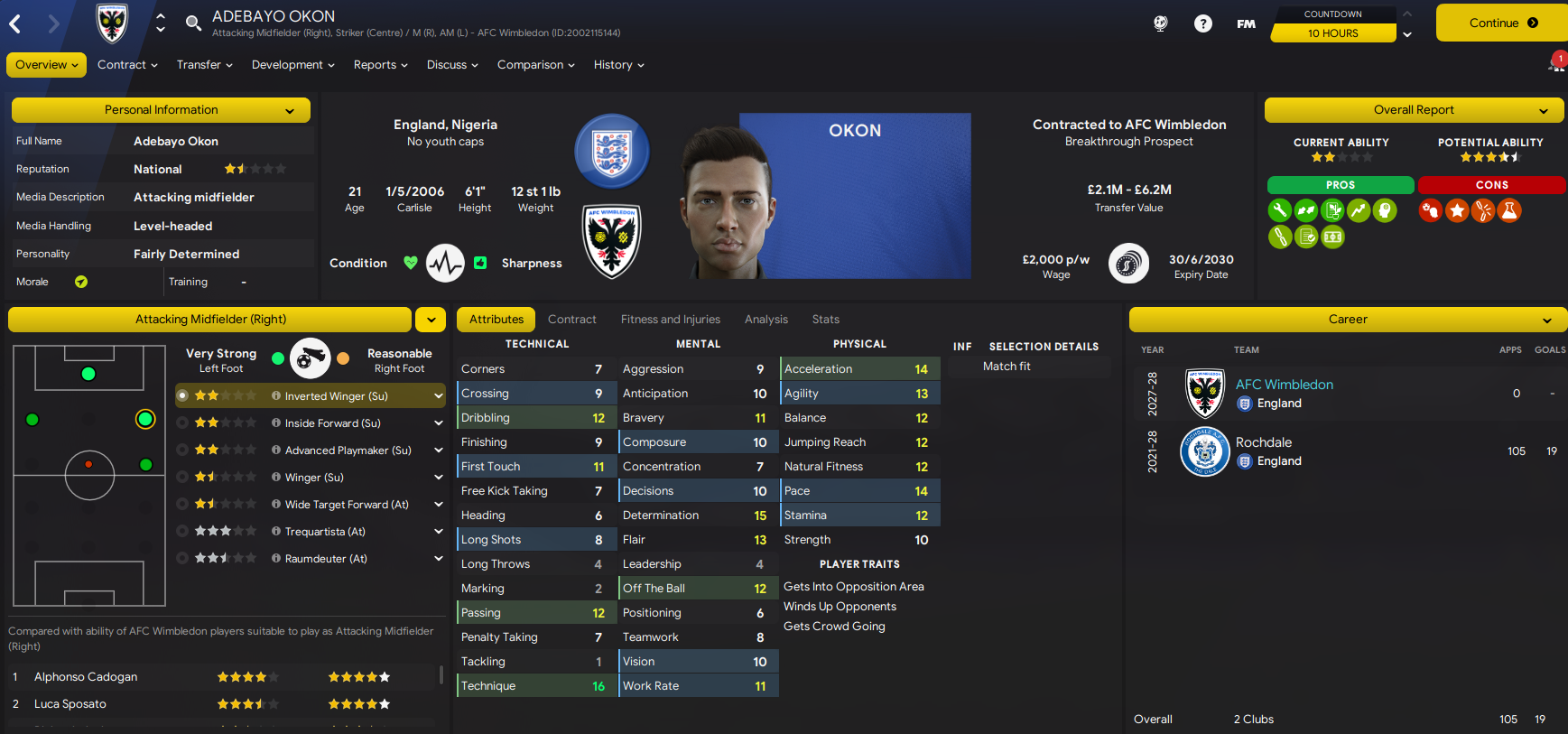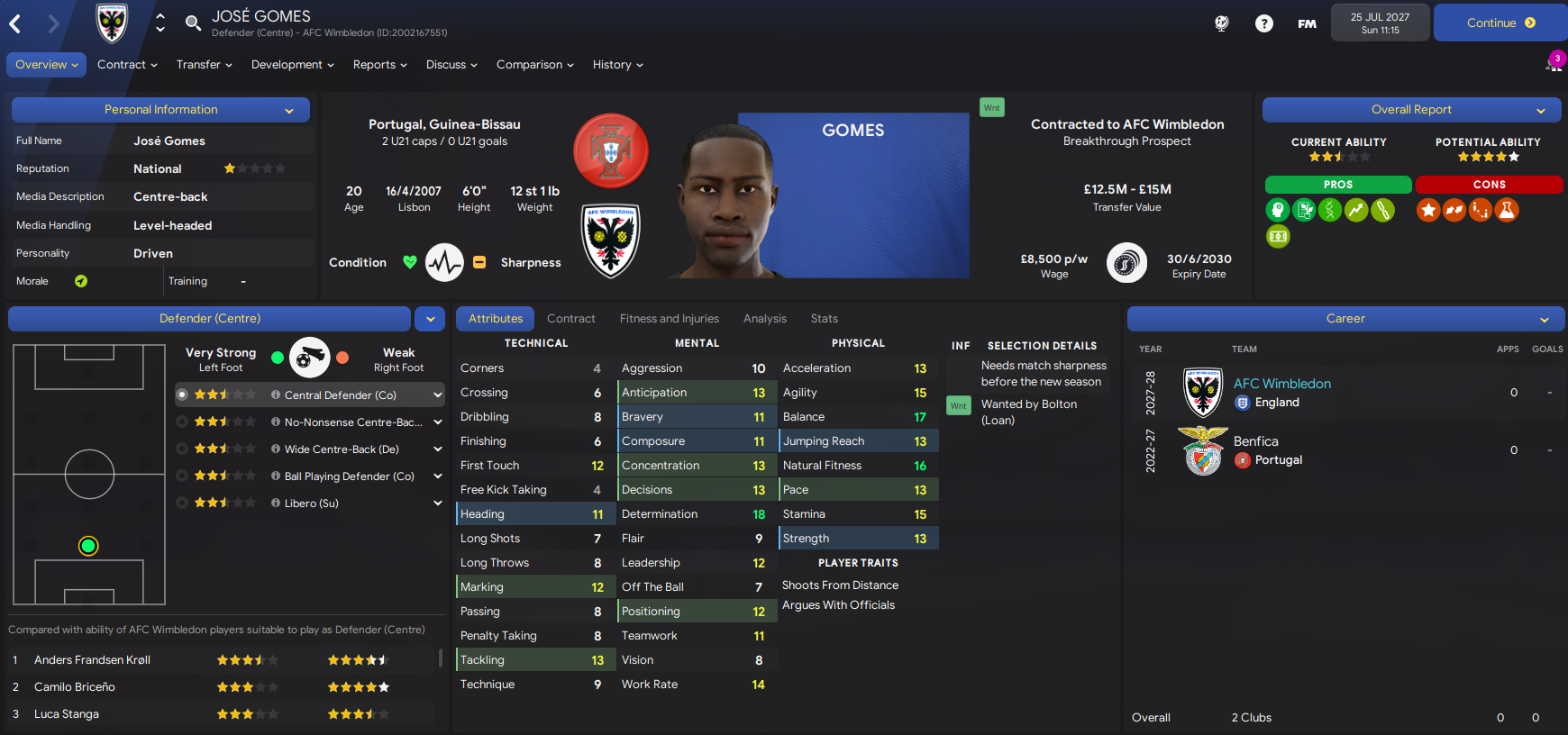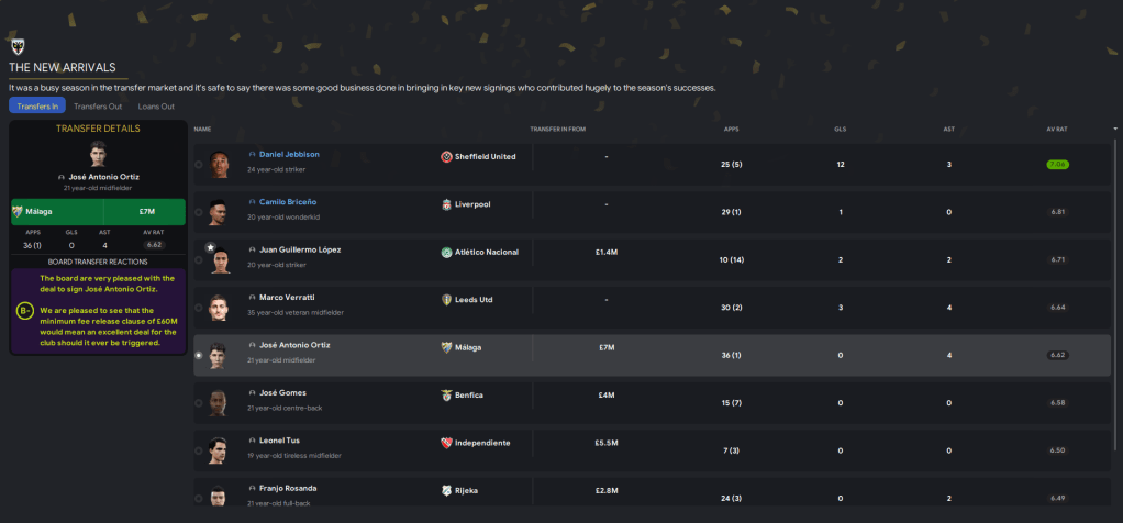 We moved early to renew the loan of Inter winger Luca Sposato. He was joined by two exciting players in left-back Franjo Rosanda, who’s already played 100 league games for Rijeka, for £1.2m and Colombian striker Juan Guillermo López for £500k from Atlético Nacional. We bolstered the defence by loaning another Colombian in Liverpool’s Camilo Briceno then exciting Portuguese centre-back José Gomes for £2m from Benfica. Then, still needing an additional striker, we turned to an old favourite as record scorer Daniel Jebbison returned for a 5th loan spell. And on deadline day we spent £500k on Rochdale’s Adebayo Okon, who I plan to train as a left-winger.