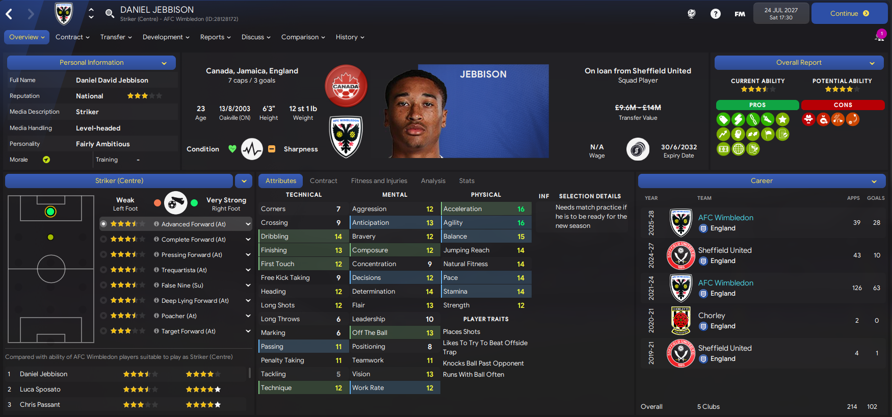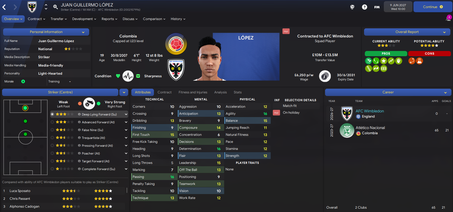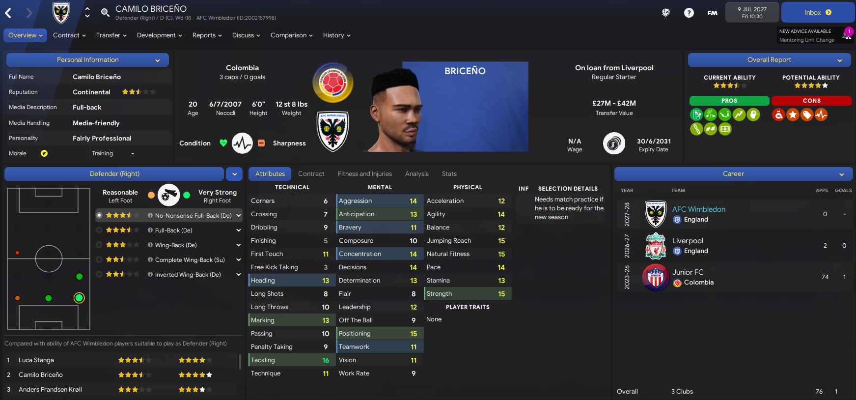 We moved early to renew the loan of Inter winger Luca Sposato. He was joined by two exciting players in left-back Franjo Rosanda, who’s already played 100 league games for Rijeka, for £1.2m and Colombian striker Juan Guillermo López for £500k from Atlético Nacional. We bolstered the defence by loaning another Colombian in Liverpool’s Camilo Briceno then exciting Portuguese centre-back José Gomes for £2m from Benfica. Then, still needing an additional striker, we turned to an old favourite as record scorer Daniel Jebbison returned for a 5th loan spell. And on deadline day we spent £500k on Rochdale’s Adebayo Okon, who I plan to train as a left-winger.