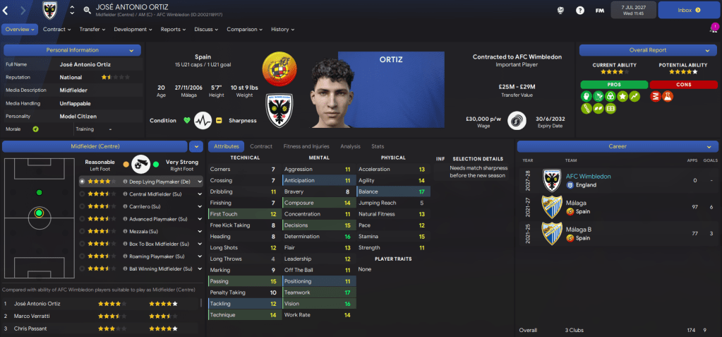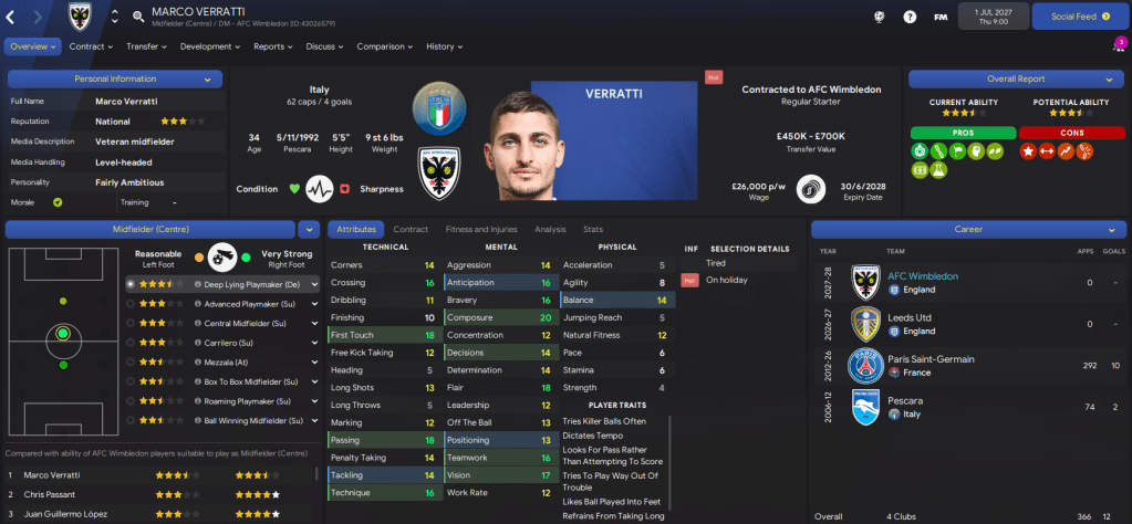 Realistically, we had very little chance of survival so I was keen to retain our focus on youth. However, I also knew experience would be crucial and you don’t get much more experience or pure shithousery than 62-time capped Italy midfielder Marco Verratti, who we snapped up on a free transfer! Now 34, his physicals may have dwindled but he still looks solid and should be a great influence in the dressing room.