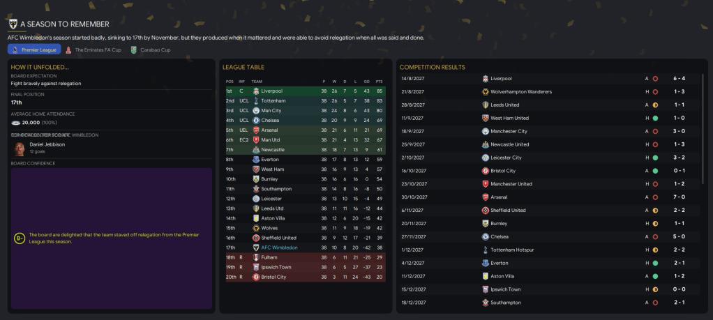 How much work will be required to rebuild for season 2 in the Premier League? And can we survive again? Join us next Wednesday to find out!