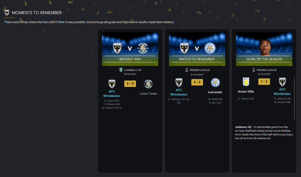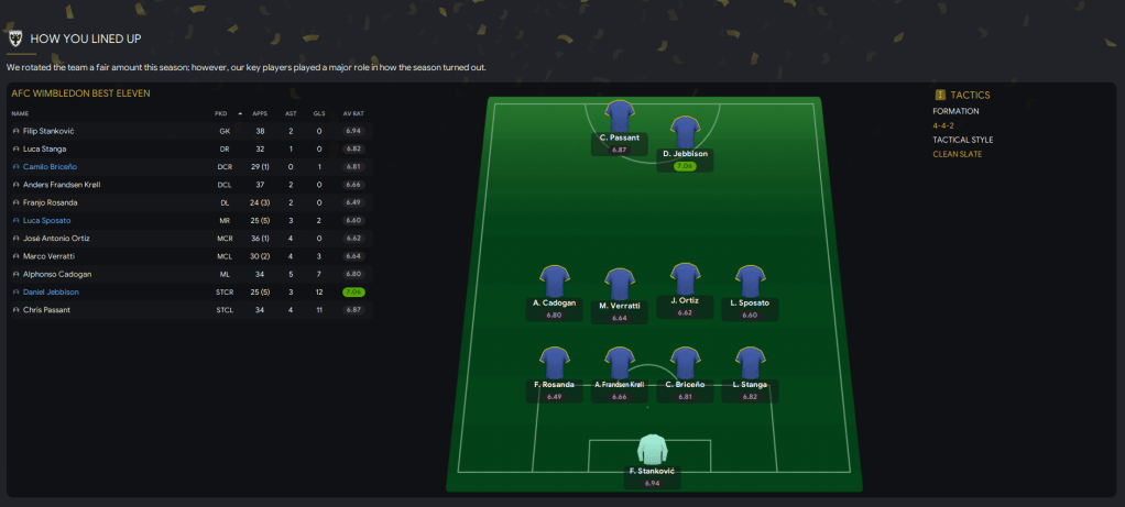 Premier League survival represents a massive achievement for AFC Wimbledon. We were overwhelming favourites to go down and just about managed to do enough to stay up. Our key player was Stankovic, who made the most saves in the Premier League as we struggled to handle Premier League attacks.