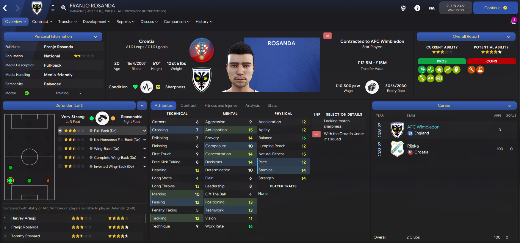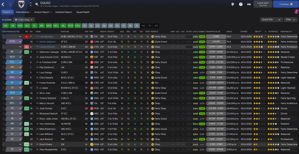 The squad remains outrageously young, with only Verratti and Butland aged over 25, only 5 players older than 23, and 6 teenagers. But check out the potential in this squad, considering 4-stars = Premier League standard, 3-stars = Championship standard, and 2-stars = League Two standard.