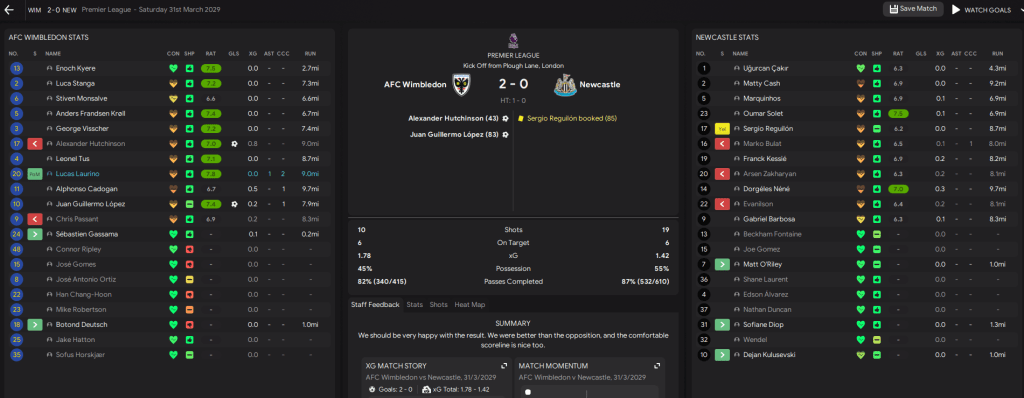 The winning start ended with a 4-3 loss at Forest as Visscher picked up his first red card. That began a run of 4 games without a win before Cadogan nicked a 1-0 at Chelsea! Then Laurino’s first goal and a Passant injury-time strike nicked a point at Villa before the midfielder scored again in a 2-0 home win over Everton. We then suffered 4 defeats in the next games, with the outlier being a 2-0 win at Leeds thanks to López and a Laurino penalty.