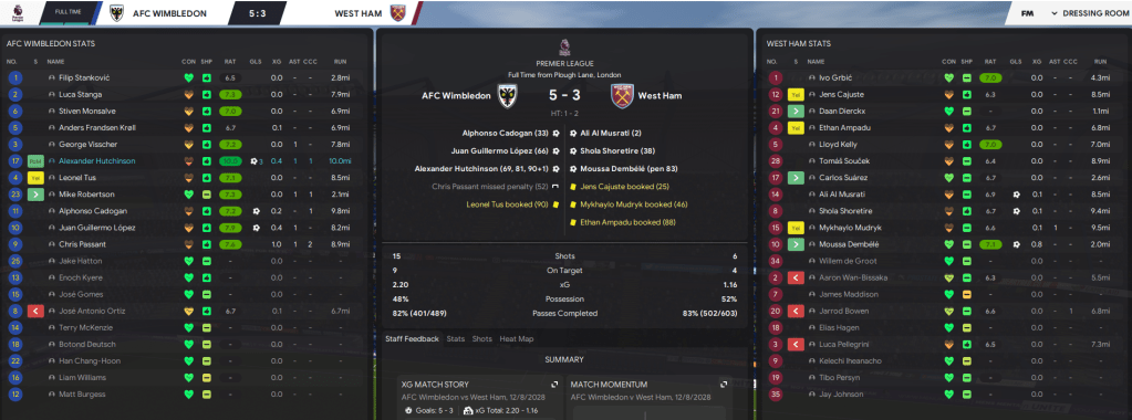 The 2028/29 campaign began at home to West Ham and, just like last year, it was a goalfest in which one of our new signings had a dreamy debut! West Ham, obviously, scored with their first shot. But two homegrown products combined as new captain Passant teed up Cadogan, only for West Ham to go ahead with their second attack just before half-time. But a stern half-time team-talk worked wonders as Hutchinson won a penalty that Passant missed then created an equaliser for Juan Guillermo López. The winger then took control by smashing a 20-minute debut hat-trick to claim a big 5-3 win!