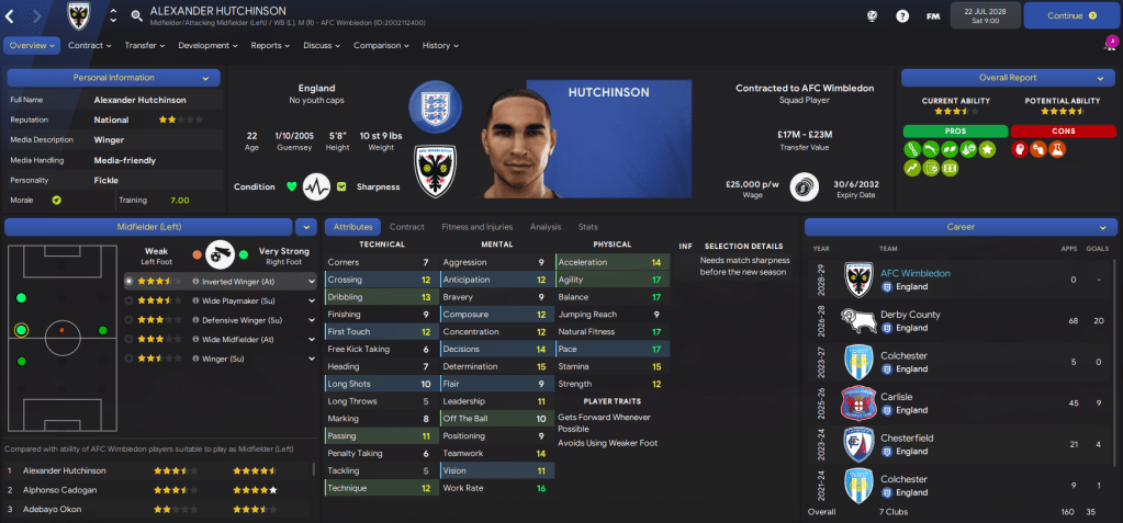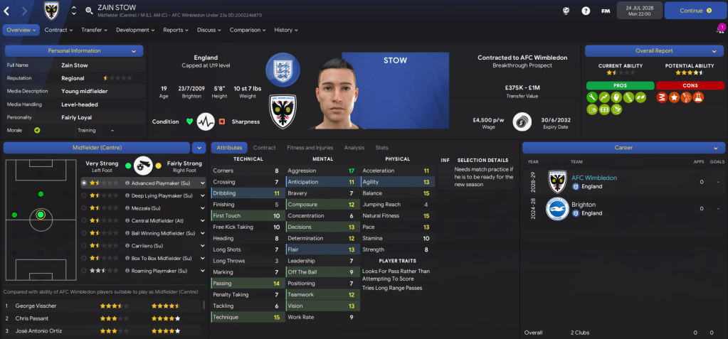 The squad is even younger than it was last season, but I think it’s slightly stronger as some of our prospects improve. Our best player is Alphonso Cadogan, who’s one of 3 players with 4-star potential (Premier League standard), while 4 players have 3.5-star ability (leading Championship). However, we have 17 players with at least 4.5-star potential, so if they can meet it we’ll be very nicely positioned.