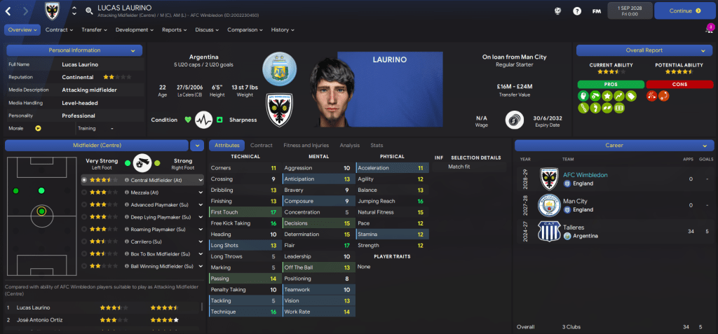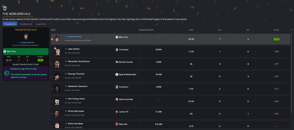 However, early in the window, the board threw their toys out of the pram regarding a club culture item to “sign players based in England” and started blocking bids I made for foreign-based players! That restricted us massively as players in England are stupidly expensive, so I attempted to trick the board into thinking we were doing it by signing terrible backups on free transfers like 35-year-old Connor Ripley. But we did sign a few decent English-based players in Derby’s rapid winger Alexander Hutchinson, Liverpool striker Jake Hatton and Brighton midfielder Zain Stow. Then on deadline day we loaned in Man City’s 6’5″ midfielder Lucas Laurino for a bit of backup.