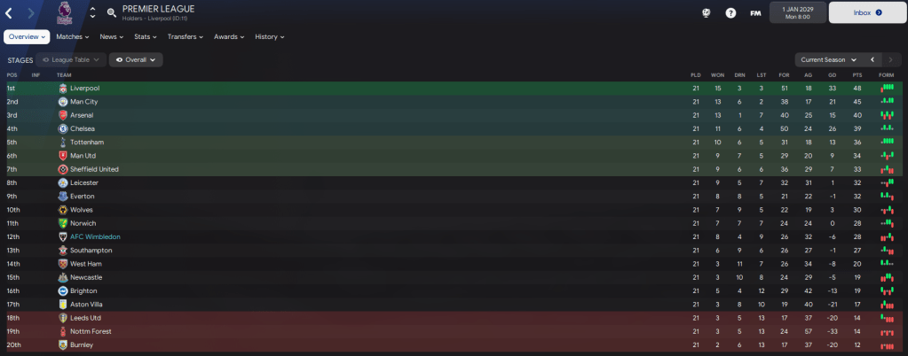 That took us into 2029 sitting pretty in mid-table with 28 points from 21 games. We’re 14 points clear of relegation so, not to tempt fate, we’re looking pretty good to stay up again. We lead the way on yellow cards with 45 and have by far the most fouls with 422, to which the nearest is Brighton’s 327. Elsewhere, Lukaku leads the way with 27 goals in 21 games!