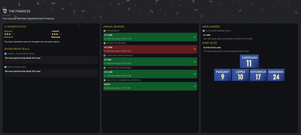 Financially, the club is also in fantastic shape, finishing the season with a balance of £142 million and a wage budget of £1.1m, of which wer’re spending just £420k.