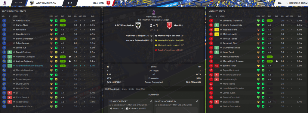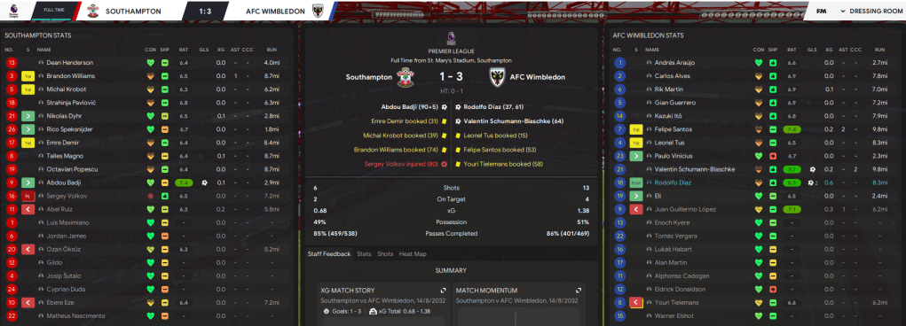 Chelsea came to Wimbledon next, having never previously lost to us. Their star striker González had a goal disallowed early on but we responded as wingers VSB and Felipe Santos finished off superb counter-attacks. Just before the break, centre-back Rik Martin headed home a VSB free-kick to make it 3-0 from just 5 shots and, unbelievably, we made it 4 through Díaz. AFC Wimbledon 4-1 Chelsea, with Andrés Araújo player of the match for 14 saves and an assist. And that’s surely the best result in club history?