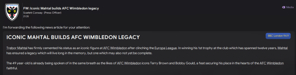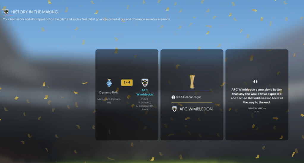 AFC Wimbledon – playing 4-4-fucking2 – were Europa League champions! That’s our first trophy after 12 years at the club and the success saw Trebor Mahtal finally declared an icon at AFC Wimbledon.