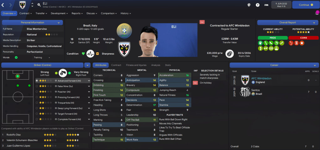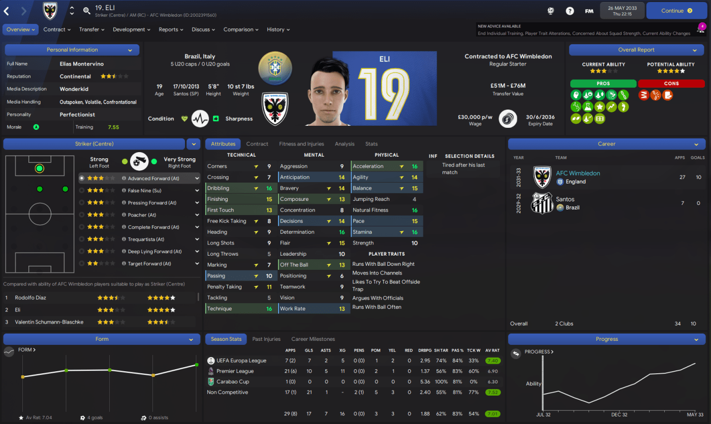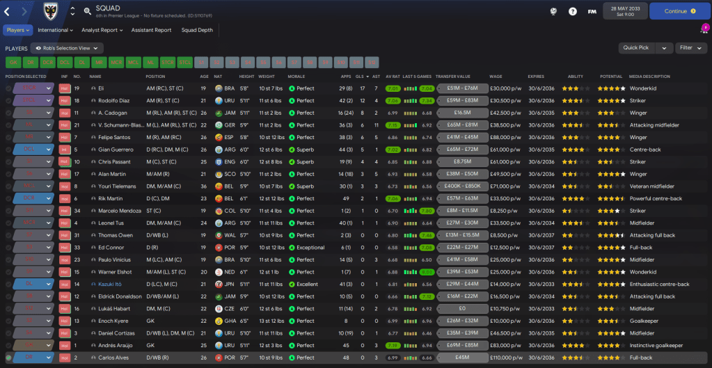 Brazilian wonderkids had been notably lacking in this save. But last season, our scouts identified a couple of 18-year-olds that would set that straight. The better of the two is probably midfielder Paulo Vinicius, who joined for £6.5m from Palmeiras and I’d earmarked as Youri Tielemans’ replacement. However, striker Eli (Elias Montervino) is also very exciting and arrived for £6.5m from Santos.