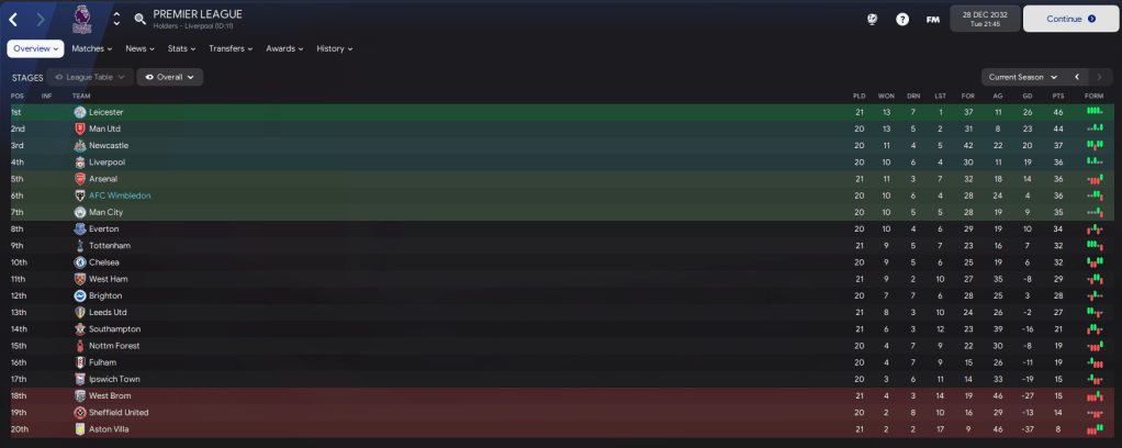 4 consecutive London derbies began with our first hammering in a while, losing 7-2 at leaders Arsenal. But we bounced back with 1-0 wins over Fulham and West Ham, then veteran Tielemans earned a 1-1 at Spurs. Two tough games over Christmas began with a strong 3-1 win at home to Leeds led by a VSB brace, but we lost 2-0 at Old Trafford 2 days later.