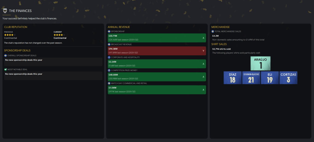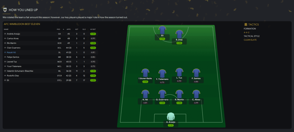 The summer tournament fallout saw me offered jobs by Portugal, Spain and France, but I was 100% committed to the Crazy Gang cause. And here’s how our 4-4-fucking2 is looking going into 2032/33:
