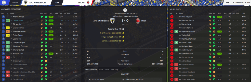 We started off in Amsterdam and an Eli double earned us a 3-3 draw in a crazy second half. The first-ever Champions League game at Plough Lane saw 7-time winners AC Milan visit the 20,000-capacity stadium. The Italians got an early shock as Díaz headed home an early cross and they never really recovered – failing to get a shot on target. And we claimed a famous victory against Milan!